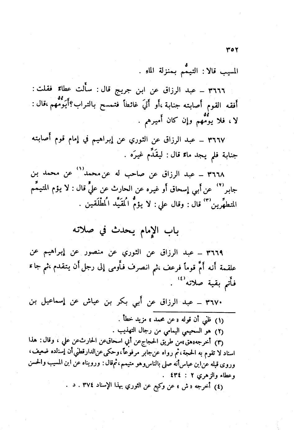 3668 - عَنْ صَاحِبٍ لَهُ، عَنْ مُحَمَّدٍ، عَنْ مُحَمَّدِ بْنِ جَابِرٍ، عَنْ أَبِي إِسْحَاقَ، أَوْ غَيْرِهِ، عَنِ الْحَارِثِ، عَنْ عَلِيٍّ قَالَ: «§لَا يَؤُمُّ الْمُتَيَمِّمُ الْمُتَطَهِّرِينَ» قَالَ: وَقَالَ عَلِيٌّ: «لَا يَؤُمُّ الْمُقَيَّدُ الْمُطْلَقِينَ»