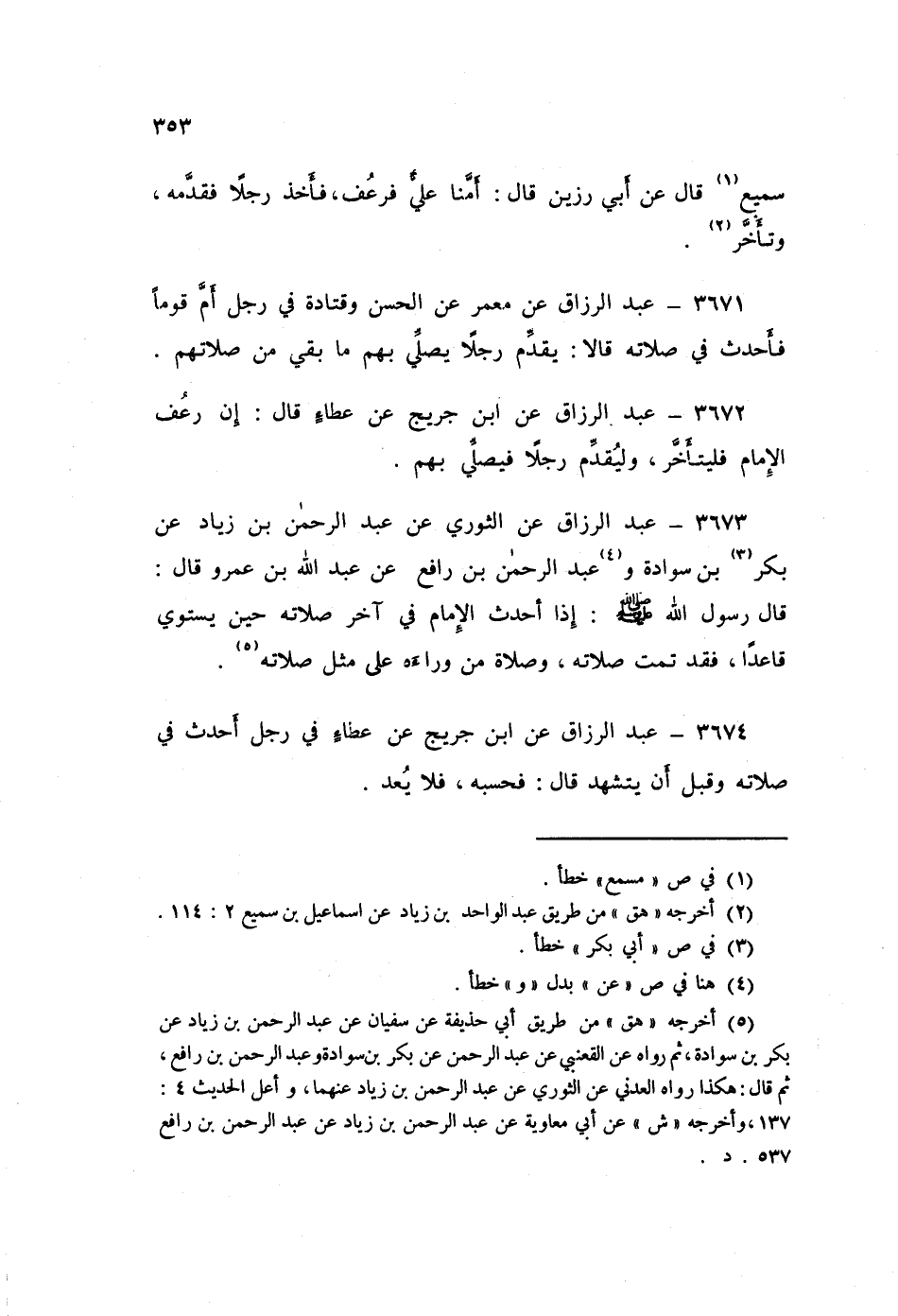 3672 - عَنِ ابْنِ جُرَيْجٍ، عَنْ عَطَاءٍ قَالَ: «§إِنْ رَعَفَ الْإِمَامُ فَلْيَتَأَخَّرْ، وَلْيُقَدِّمْ رَجُلًا فَيُصَلِّي بِهِمْ»