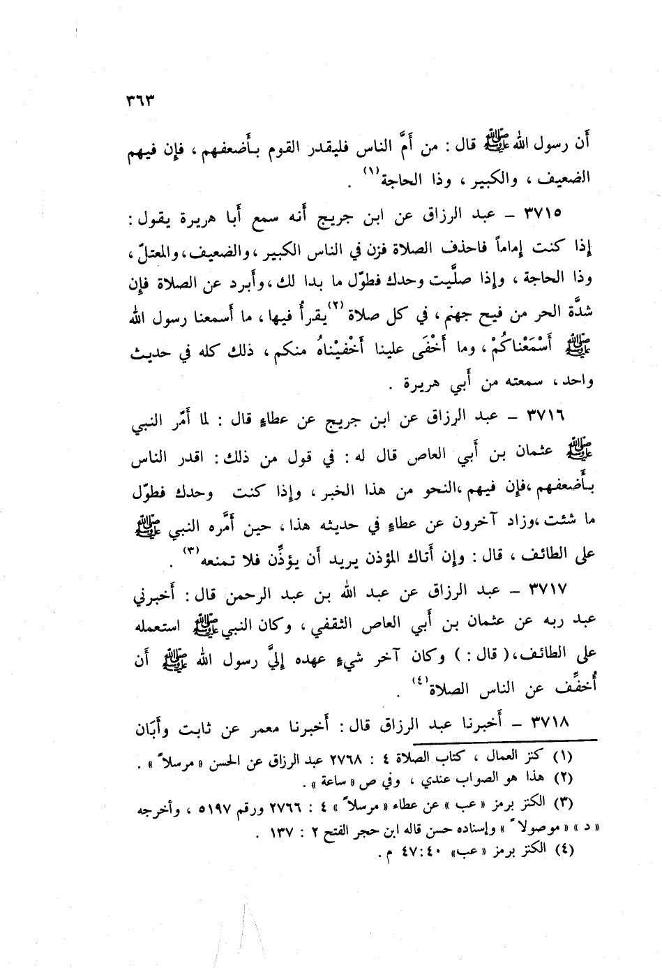 3716 - عَنِ ابْنِ جُرَيْجٍ، عَنْ عَطَاءٍ قَالَ: لَمَّا أَمَرَ النَّبِيُّ صَلَّى اللهُ عَلَيْهِ وَسَلَّمَ عُثْمَانَ بْنَ أَبِي الْعَاصِ قَالَ لَهُ فِي قَوْلٍ مِنْ ذَلِكَ: «§اقْدُرِ النَّاسَ بِأَضْعَفِهِمْ، فَإِنَّ فِيهِمُ النَّحْوُ مِنْ هَذَا الْخَبَرِ، وَإِذَا كُنْتَ وَحْدَكَ فَطَوِّلْ مَا شِئْتَ» وَزَادَ آخَرُونَ عَنْ عَطَاءٍ فِي حَدِيثِهِ هَذَا حِينَ أَمَّرَهُ النَّبِيُّ صَلَّى اللهُ عَلَيْهِ وَسَلَّمَ عَلَى الطَّائِفِ قَالَ: «وَإِنْ أَتَاكَ الْمُؤَذِّنُ يُرِيدُ أَنْ يُؤَذِّنَ فَلَا تَمْنَعْهُ»