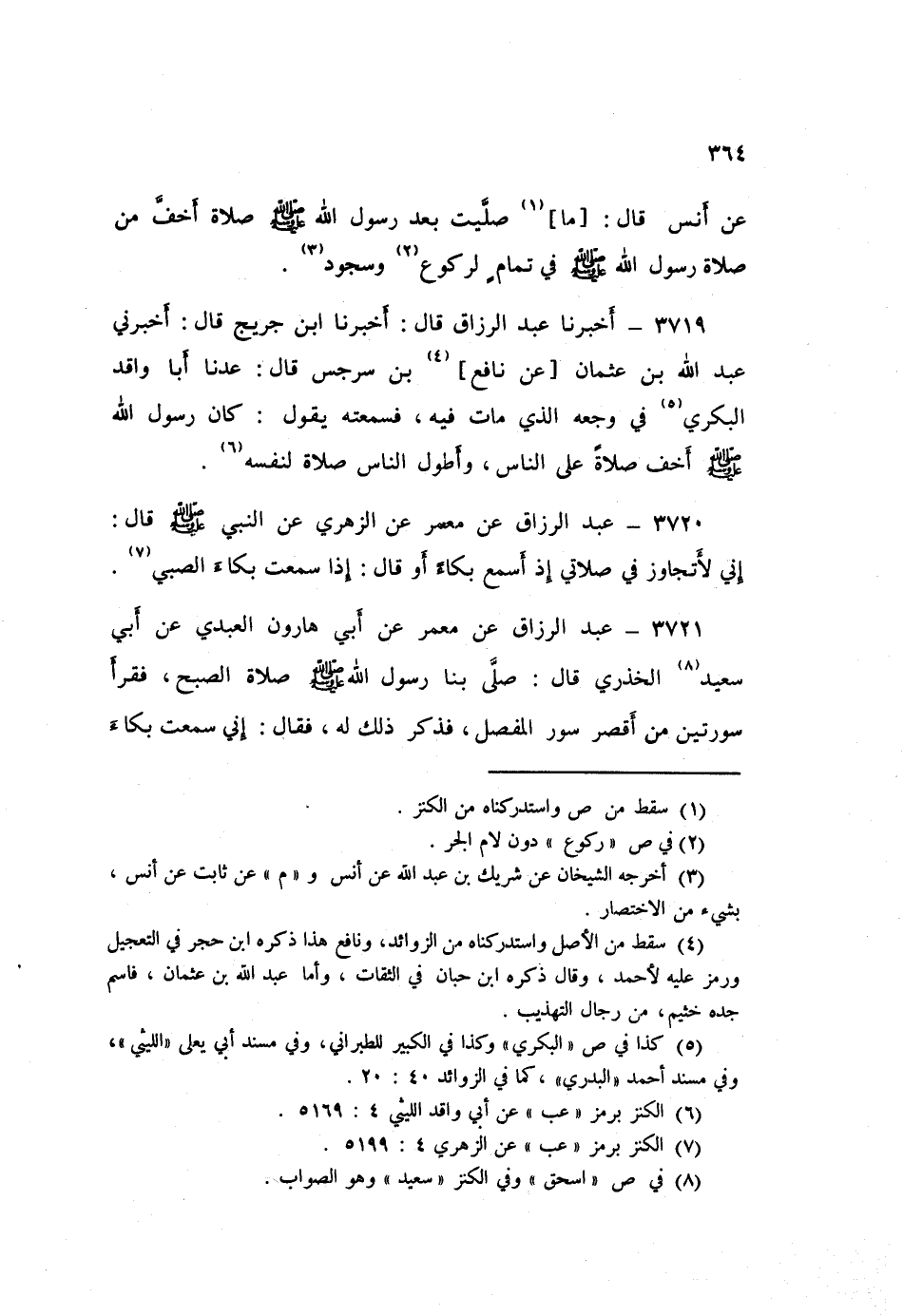 3719 - عَبْدُ الرَّزَّاقِ، أَخْبَرَنَا ابْنُ جُرَيْجٍ قَالَ: أَخْبَرَنِي عَبْدُ اللَّهِ بْنُ عُثْمَانَ، عَنْ نَافِعِ بْنِ سَرْجِسَ قَالَ: عُدْنَا أَبَا وَاقِدٍ الْبَكْرِيَّ فِي وَجَعِهِ الَّذِي مَاتَ فِيهِ، فَسَمِعْتُهُ يَقُولُ: «كَانَ رَسُولُ اللَّهِ صَلَّى اللهُ عَلَيْهِ وَسَلَّمَ §أَخَفَّ صَلَاةٍ عَلَى النَّاسِ وَأَطْوَلَ النَّاسِ صَلَاةً لِنَفْسِهِ»