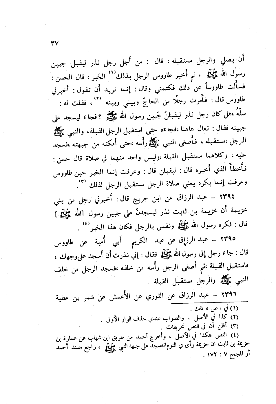 2394 - عَنِ ابْنِ جُرَيْجٍ قَالَ: أَخْبَرَنِي رَجُلٌ، مِنْ بَنِي خُزَيْمَةَ: أَنَّ خُزَيْمَةَ بْنَ ثَابِتٍ، §نَذَرَ لَيَسْجُدَنَّ عَلَى جَبِينِ رَسُولِ اللَّهِ صَلَّى اللهُ عَلَيْهِ وَسَلَّمَ قَالَ: «فَكَرِهَ رَسُولُ اللَّهِ صَلَّى اللهُ عَلَيْهِ وَسَلَّمَ، وَنَفْسُ الرَّجُلِ فَكَانَ هَذَا الْخَبَرُ»