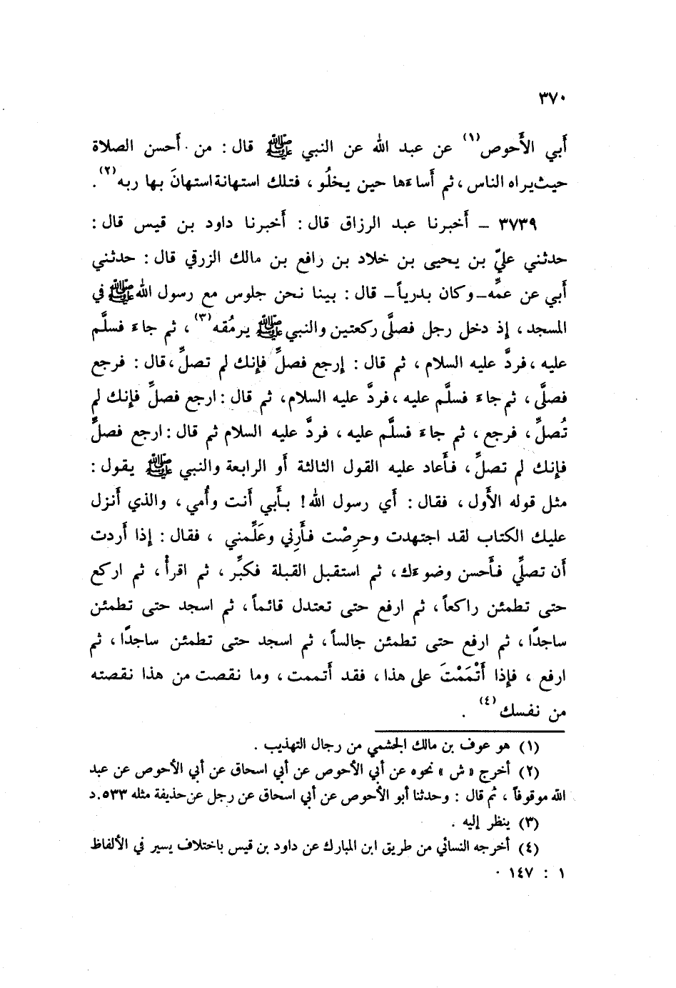 3739 - عَبْدُ الرَّزَّاقِ، أَخْبَرَنَا دَاوُدُ بْنُ قَيْسٍ قَالَ: حَدَّثَنِي عَلِيُّ بْنُ يَحْيَى بْنِ خَلَّادِ بْنِ رَافِعِ بْنِ مَالِكٍ الزُّرَقِيُّ قَالَ: حَدَّثَنِي أَبِي، عَنْ عَمِّهِ - وَكَانَ بَدْرِيًّا - قَالَ: بَيْنَا نَحْنُ جُلُوسٌ مَعَ رَسُولِ اللَّهِ صَلَّى اللهُ عَلَيْهِ وَسَلَّمَ فِي الْمَسْجِدِ، إِذْ دَخَلَ رَجُلٌ فَصَلَّى رَكْعَتَيْنِ، وَالنَّبِيُّ صَلَّى اللهُ عَلَيْهِ وَسَلَّمَ يَرْمُقُهُ، ثُمَّ جَاءَ فَسَلَّمَ عَلَيْهِ، فَرَدَّ عَلَيْهِ السَّلَامَ ثُمَّ قَالَ: «ارْجِعْ فَصَلِّ فَإِنَّكَ لَمْ تُصَلِّ» قَالَ: فَرَجَعَ فَصَلَّى، ثُمَّ جَاءَ فَسَلَّمَ عَلَيْهِ، فَرَدَّ عَلَيْهِ السَّلَامَ، ثُمَّ قَالَ: «ارْجِعْ فَصَلِّ فَإِنَّكَ لَمْ تُصَلِّ»، فَرَجَعَ ثُمَّ جَاءَ فَسَلَّمَ عَلَيْهِ، فَرَدَّ عَلَيْهِ السَّلَامَ، ثُمَّ قَالَ: «ارْجِعْ فَصَلِّ فَإِنَّكَ لَمْ تُصَلِّ»، فَأَعَادَ عَلَيْهِ الْقَوْلَ الثَّالِثَةَ أَوِ الرَّابِعَةَ، وَالنَّبِيُّ صَلَّى اللهُ عَلَيْهِ وَسَلَّمَ يَقُولُ مِثْلَ قَوْلِهِ الْأَوَّلِ، فَقَالَ: أَيْ رَسُولَ اللَّهِ، بِأَبِي أَنْتَ وَأُمِّي، وَالَّذِي أَنْزَلَ عَلَيْكَ الْكِتَابَ لَقَدِ اجْتَهَدْتُ وَحَرِصْتُ فَأَرِنِي وَعَلِّمْنِي، فَقَالَ: «§إِذَا أَرَدْتَ أَنْ تُصَلِّيَ فَأَحْسِنْ وُضُوءَكَ، ثُمَّ اسْتَقْبِلِ الْقِبْلَةَ فَكَبِّرْ، ثُمَّ اقْرَأْ، ثُمَّ ارْكَعْ حَتَّى تَطْمَئِنَّ رَاكِعًا، ثُمَّ ارْفَعْ حَتَّى تَعْتَدِلَ قَائِمًا، ثُمَّ اسْجُدْ حَتَّى تَطْمَئِنَّ سَاجِدًا، ثُمَّ ارْفَعْ حَتَّى تَطْمَئِنَّ جَالِسًا، ثُمَّ اسْجُدْ حَتَّى تَطْمَئِنَّ سَاجِدًا، ثُمَّ ارْفَعْ، فَإِذَا أَتْمَمْتَ عَلَى هَذَا، فَقَدْ أَتْمَمْتَ وَمَا نَقَصْتَ مِنْ هَذَا نَقَصْتَهُ مِنْ نَفْسِكَ»