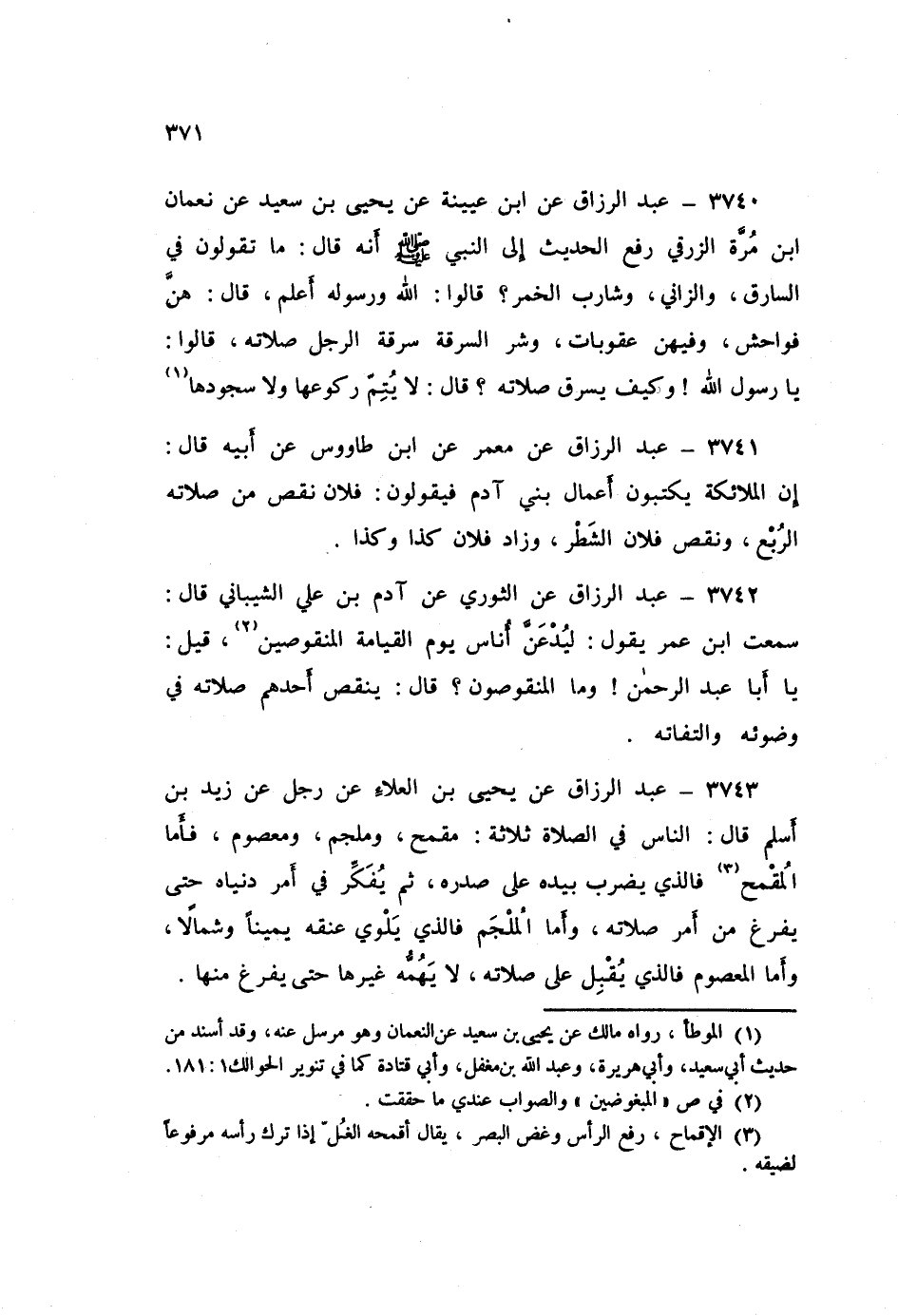 3743 - عَنْ يَحْيَى بْنِ الْعَلَاءِ، عَنْ رَجُلٍ، عَنْ زَيْدِ بْنِ أَسْلَمَ قَالَ: " §النَّاسُ فِي الصَّلَاةِ ثَلَاثَةٌ: مُقْمَحٌ، وَمُلْجَمٌ، وَمَعْصُومٌ، فَأَمَّا الْمُقْمَحُ: فَالَّذِي يَضْرِبُ بِيَدِهِ عَلَى صَدْرِهِ، ثُمَّ يُفَكِّرُ فِي أَمْرِ دُنْيَاهُ حَتَّى يَفْرُغَ مِنْ أَمْرِ صَلَاتِهِ، وَأَمَّا الْمُلْجَمُ: فَالَّذِي يَلْوِي عُنُقَهُ يَمِينًا وَشِمَالًا، وَأَمَّا الْمَعْصُومُ: فَالَّذِي يُقْبِلُ عَلَى صَلَاتِهِ، لَا يَهُمُّهُ غَيْرُهَا حَتَّى يَفْرُغَ مِنْهَا "