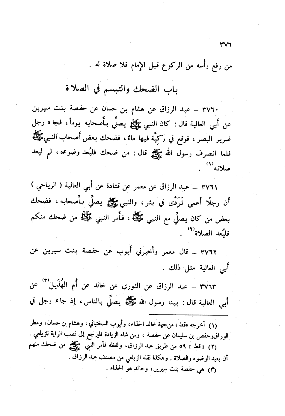 3761 - عَنْ مَعْمَرٍ، عَنْ قَتَادَةَ، عَنْ أَبِي الْعَالِيَةِ الرِّيَاحِيِّ: أَنَّ رَجُلًا أَعْمَى تَرَدَّى فِي بِئْرٍ وَالنَّبِيُّ صَلَّى اللهُ عَلَيْهِ وَسَلَّمَ يُصَلِّي بِأَصْحَابِهِ، فَضَحِكَ بَعْضُ مَنْ كَانَ يُصَلِّي مَعَ النَّبِيِّ صَلَّى اللهُ عَلَيْهِ وَسَلَّمَ، فَأَمَرَ النَّبِيُّ صَلَّى اللهُ عَلَيْهِ وَسَلَّمَ: «§مَنْ ضَحِكَ مِنْكُمْ فَلْيُعِدِ الصَّلَاةَ»