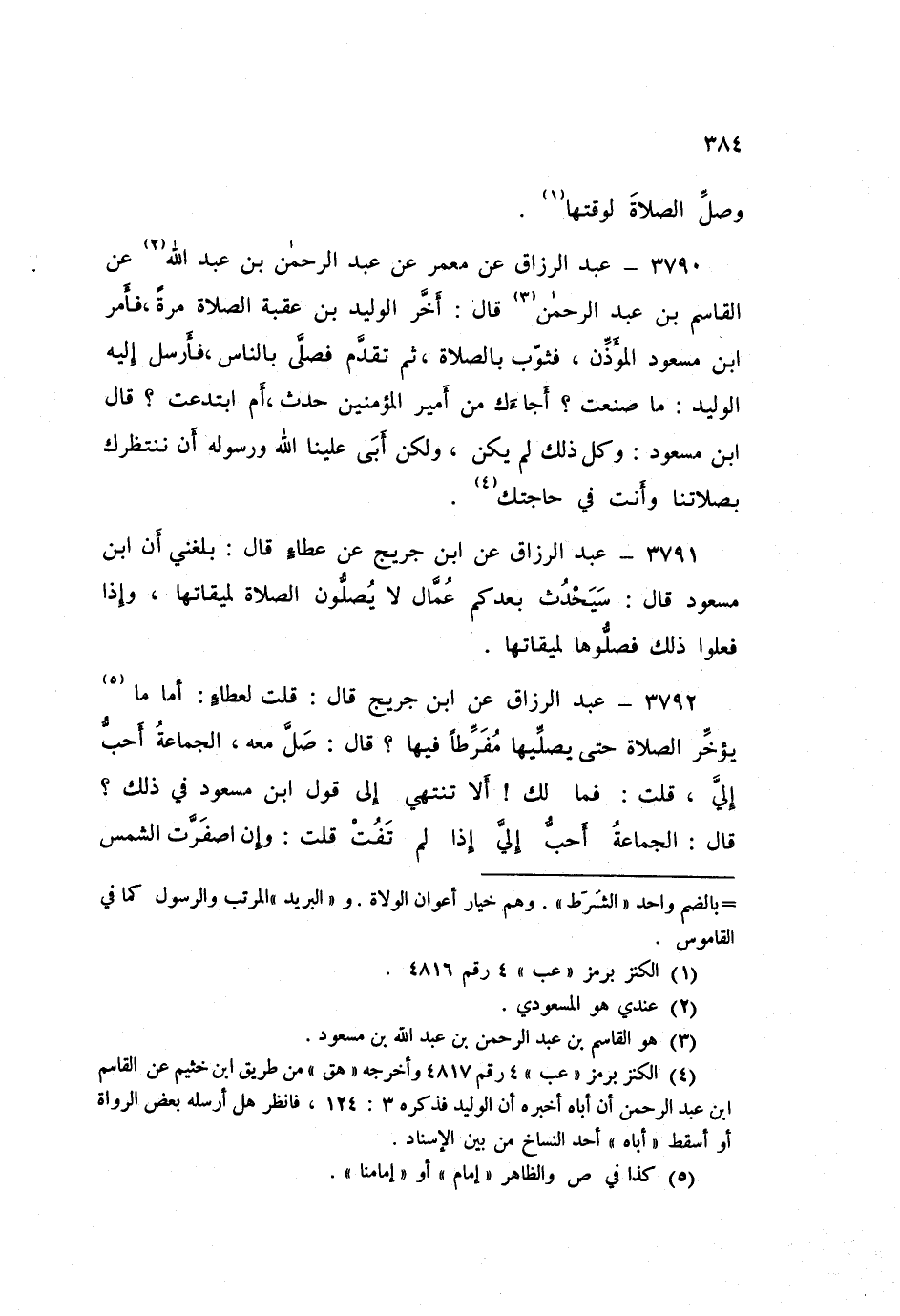 3791 - عَنِ ابْنِ جُرَيْجٍ، عَنْ عَطَاءٍ قَالَ: بَلَغَنِي أَنَّ ابْنَ مَسْعُودٍ قَالَ: «§سَيَحْدُثُ بَعْدَكُمْ عُمَّالٌ لَا يُصَلُّونَ الصَّلَاةَ لِمِيقَاتِهَا، وَإِذَا فَعَلُوا ذَلِكَ فَصَلُّوهَا لِمِيقَاتِهَا»