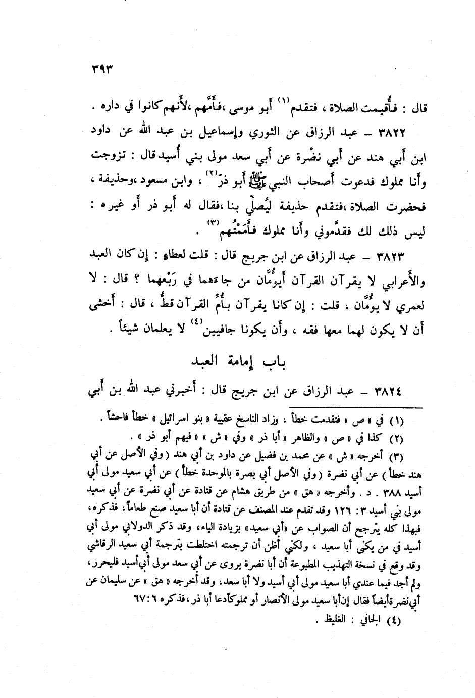 3824 - عَنِ ابْنِ جُرَيْجٍ قَالَ: أَخْبَرَنِي عَبْدُ اللَّهِ بْنُ أَبِي مُلَيْكَةَ، أَنَّهُمْ كَانُوا يَأْتُونَ عَائِشَةَ أُمَّ الْمُؤْمِنِينَ بِأَعْلَى الْوَادِي هُوَ وَأَبُوهُ، وَعُبَيْدُ بْنُ عُمَيْرٍ، وَالْمِسْوَرُ بْنُ مَخْرَمَةَ، وَنَاسٌ كَثِيرٌ، فَيَؤُمُّهُمْ أَبُو عُمَرَ مَوْلَى عَائِشَةَ، وَأَبُو عَمْرٍو غُلَامُهَا لَمْ يُعْتِقْ، فَكَانَ إِمَامَ أَهْلِهَا مُحَمَّدِ بْنِ أَبِي بَكْرٍ، وَعُرْوَةَ، وَأَهْلِهِمَا، إِلَّا عَبْدَ اللَّهِ بْنَ عَبْدِ الرَّحْمَنِ بْنِ أَبِي بَكْرٍ كَانَ يَسْتَأْخِرُ عَنْهُ أَبُو عَمْرٍو قَالَتْ عَائِشَةُ: «§إِذَا غَيَّبَنِي أَبُو عَمْرٍو وَدَلَّانِي فِي حُفْرَتِي فَهُوَ حُرٌّ»