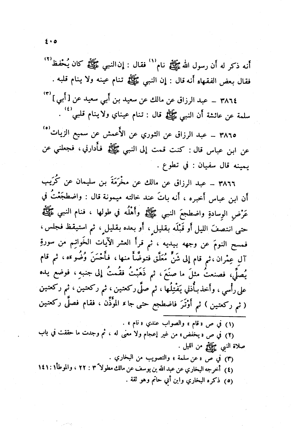 3866 - عَنْ مَالِكٍ، عَنْ مَخْرَمَةَ بْنِ سُلَيْمَانَ، عَنْ كُرَيْبٍ، أَنَّ ابْنَ عَبَّاسٍ أَخْبَرَهُ، أَنَّهُ بَاتَ عِنْدَ خَالَتُهِ مَيْمُونَةَ قَالَ: «وَاضْطَجَعْتُ فِي عَرَضِ الْوِسَادَةِ، وَاضْطَجَعَ النَّبِيُّ صَلَّى اللهُ عَلَيْهِ وَسَلَّمَ وَأَهْلُهُ فِي طُولِهَا، فَنَامَ النَّبِيُّ صَلَّى اللهُ عَلَيْهِ وَسَلَّمَ حَتَّى انْتَصَفَ اللَّيْلُ، أَوْ قَبْلَهُ بِقَلِيلٍ، أَوْ بَعْدَهُ بِقَلِيلٍ، ثُمَّ أَسْتَيْقِظَ فَجَلَسَ، فَمَسَحَ النَّوْمَ عَنْ وَجْهِهِ بِيَدَيْهِ، ثُمَّ §قَرَأَ الْعَشْرَ الْآيَاتِ الْخَوَاتِمَ مِنْ سُورَةِ آلِ عِمْرَانَ، ثُمَّ قَامَ إِلَى شَنٍّ مُعَلَّقٍ، فَتَوَضَّأَ مِنْهَا فَأَحْسَنَ وُضُوءَهُ، ثُمَّ قَامَ يُصَلِّي، فَصَنَعْتُ مِثْلَ مَا صَنَعَ، ثُمَّ ذَهَبْتُ فَقُمْتُ إِلَى جَنْبِهِ، فَوَضَعَ يَدَيْهِ عَلَى رَأْسِي، وَأَخَذَ بِأُذُنِي يَفْتِلُهَا، ثُمَّ صَلَّى رَكْعَتَيْنِ، ثُمَّ رَكْعَتَيْنِ، ثُمَّ رَكْعَتَيْنِ، ثُمَّ رَكْعَتَيْنِ، ثُمَّ أَوْتَرَ، فَاضْطَجَعَ حَتَّى جَاءَ الْمُؤَذِّنُ، فَقَامَ فَصَلَّى رَكْعَتَيْنِ -[406]- خَفِيفَتَيْنِ، ثُمَّ خَرَجَ فَصَلَّى الصُّبْحَ»