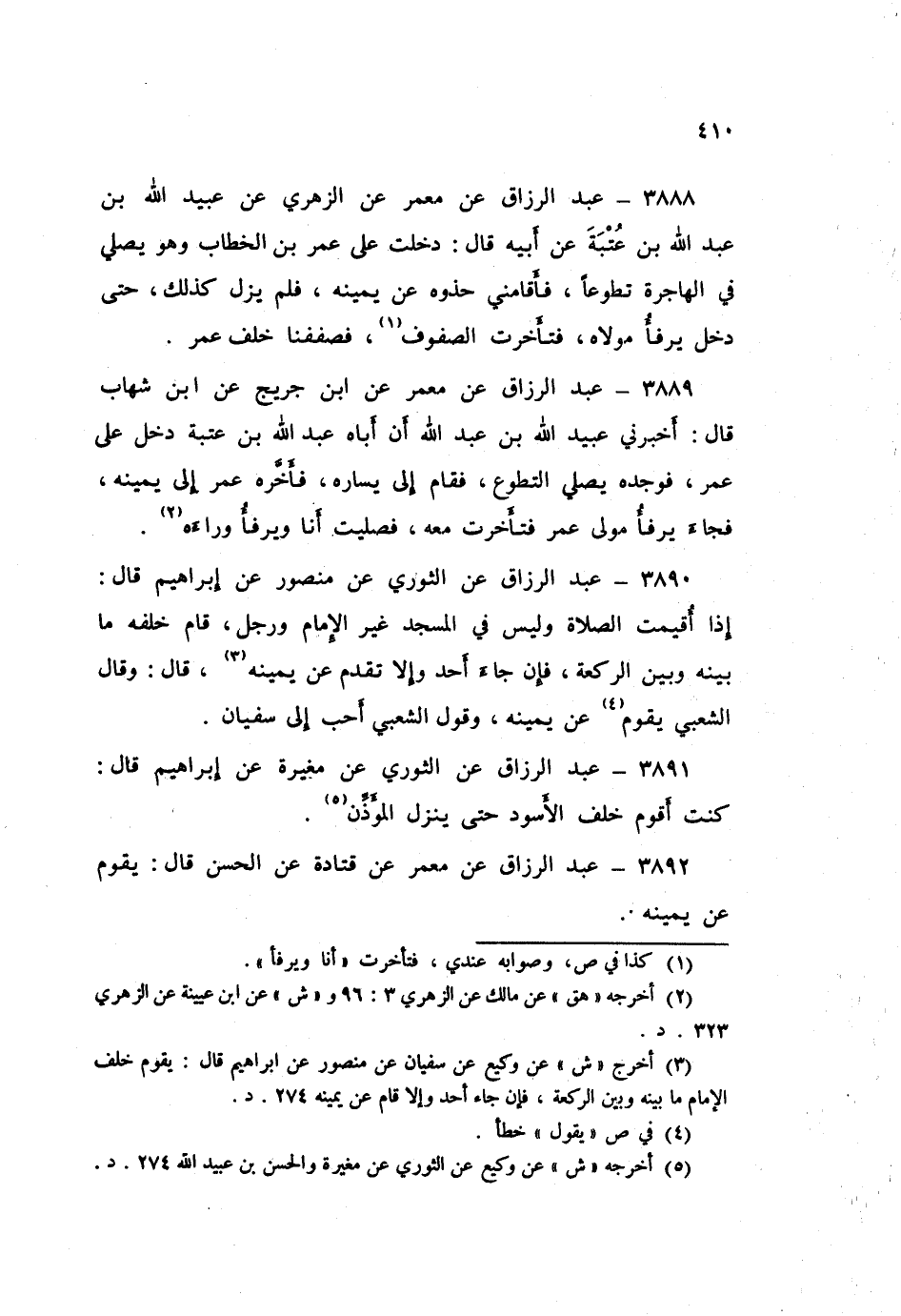 3889 - عَنْ مَعْمَرٍ، عَنِ ابْنِ جُرَيْجٍ، عَنِ ابْنِ شِهَابٍ قَالَ: أَخْبَرَنِي عُبَيْدُ اللَّهِ بْنُ عَبْدِ اللَّهِ: «أَنَّ أَبَاهُ عَبْدَ اللَّهِ بْنَ عُتْبَةَ، دَخَلَ عَلَى عُمَرَ، فَوَجَدَهُ يُصَلِّي التَّطَوُّعَ، فَقَامَ إِلَى يَسَارِهِ، §فَأَخَّرَهُ عُمَرُ إِلَى يَمِينِهِ، فَجَاءَ يَرْفَأُ مَوْلَى عُمَرَ، فَتَأَخَّرْتُ مَعَهُ، فَصَلَّيْتُ أَنَا وَيَرْفَأُ وَرَاءَهُ»