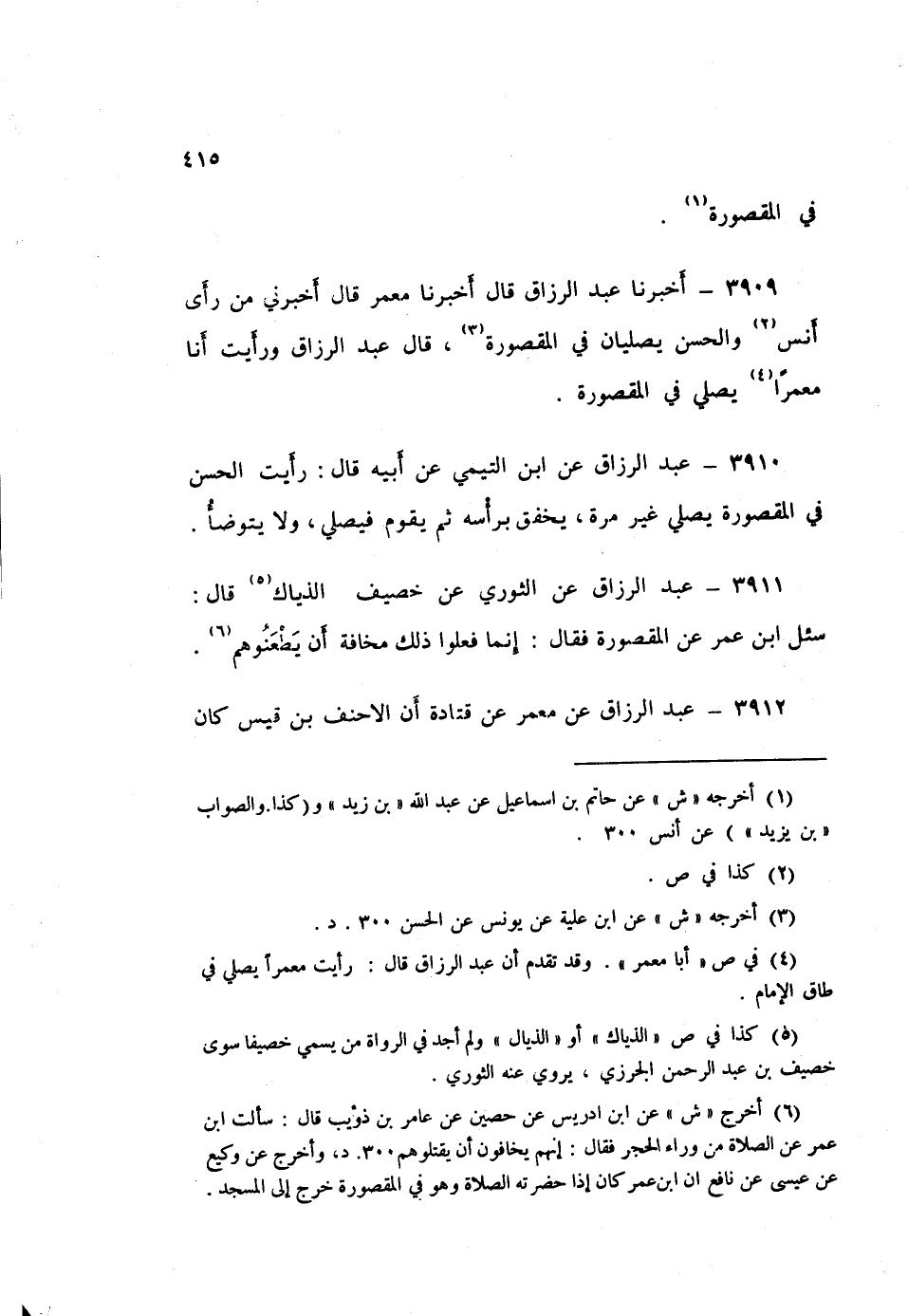 3909 - عَبْدُ الرَّزَّاقِ، أَخْبَرَنَا مَعْمَرٌ قَالَ: أَخْبَرَنِي مَنْ «رَأَى أَنَسًا، وَالْحَسَنَ §يُصَلِّيَانِ فِي الْمَقْصُورَةِ» قَالَ عَبْدُ الرَّزَّاقِ: «وَرَأَيْتُ أَنَا مَعْمَرًا يُصَلِّي فِي الْمَقْصُورَةِ»