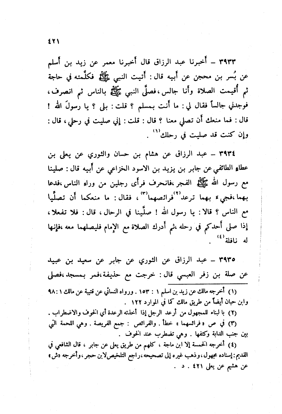 3933 - عَبْدُ الرَّزَّاقِ، أَخْبَرَنَا مَعْمَرٌ، عَنْ زَيْدِ بْنِ أَسْلَمَ، عَنْ بُسْرِ بْنِ مِحْجَنٍ، عَنْ أَبِيهِ قَالَ: أَتَيْتُ النَّبِيَّ صَلَّى اللهُ عَلَيْهِ وَسَلَّمَ فَكَلَّمْتُهُ فِي حَاجَةٍ، ثُمَّ أُقِيمَتِ الصَّلَاةُ وَأَنَا جَالِسٌ، فَصَلَّى النَّبِيُّ صَلَّى اللهُ عَلَيْهِ وَسَلَّمَ بِالنَّاسِ ثُمَّ انْصَرَفَ، فَوَجَدَنِي جَالِسًا، فَقَالَ لِي: «مَا أَنْتَ بِمُسْلِمٍ؟» قُلْتُ: بَلَى يَا رَسُولَ اللَّهِ قَالَ: «§فَمَا مَنَعَكَ أَنْ تُصَلِّيَ مَعَنَا؟» قَالَ: قُلْتُ: إِنِّي صَلَّيْتُ فِي رَحْلِي قَالَ: «وَإِنْ كُنْتَ قَدْ صَلَّيْتَ فِي رَحْلِكَ»