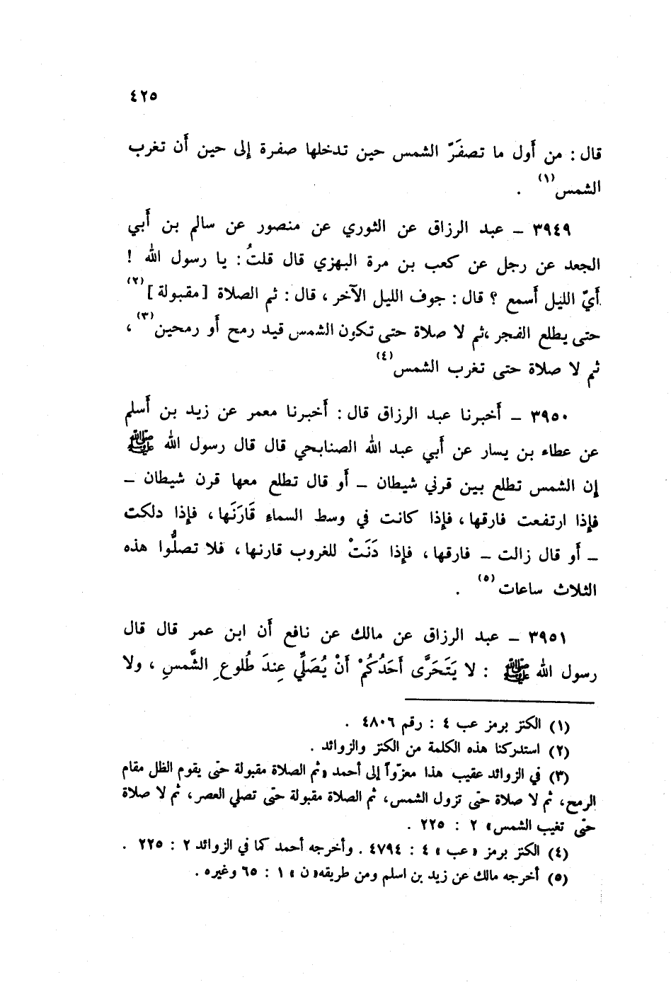 3950 - عَبْدُ الرَّزَّاقِ قال: أَخْبَرَنَا مَعْمَرٌ، عَنْ زَيْدِ بْنِ أَسْلَمَ، عَنْ عَطَاءِ بْنِ يَسَارٍ، عَنْ أَبِي عَبْدِ اللَّهِ الصُّنَابِحِيّ قَالَ: قَالَ رَسُولُ اللَّهِ صَلَّى اللهُ عَلَيْهِ وَسَلَّمَ: " إِنَّ §الشَّمْسَ تَطْلُعُ بَيْنَ قَرْنَيْ شَيْطَانٍ - أَوْ قَالَ: تَطْلُعُ مَعَهَا قَرْنُ شَيْطَانٍ - فَإِذَا ارْتَفَعَتْ فَارَقَهَا، فَإِذَا كَانَتْ فِي وَسَطِ السَّمَاءِ قَارَنَهَا، فَإِذَا دَلَكَتْ - أَوْ قَالَ: زَالَتْ - فَارَقَهَا، فَإِذَا دَنَتْ لِلْغُرُوبِ قَارَنَهَا، فَلَا تُصَلُّوا هَذِهِ الثَّلَاثَ سَاعَاتٍ "