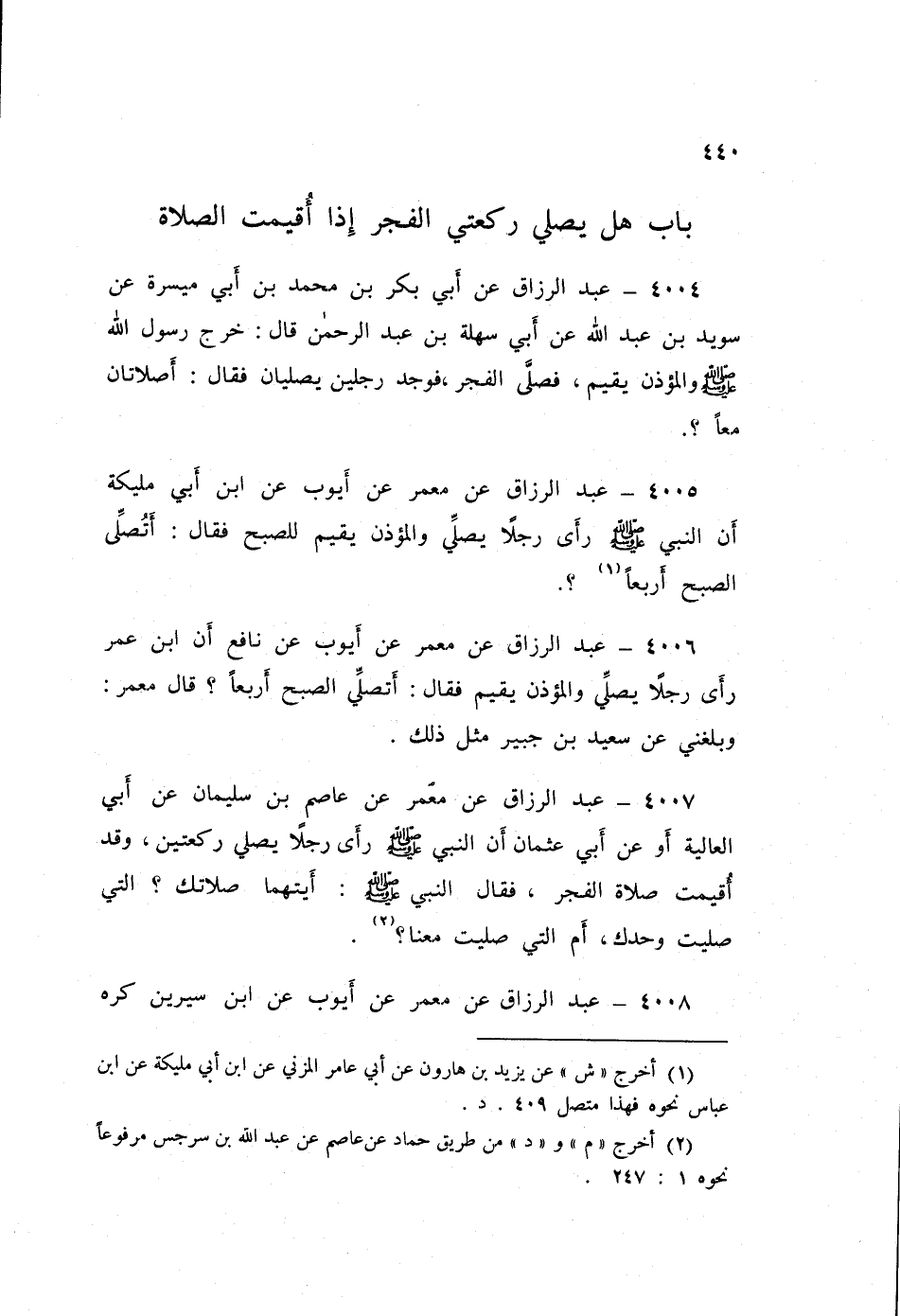 4007 - عَنْ مَعْمَرٍ، عَنْ عَاصِمِ بْنِ سُلَيْمَانَ، عَنْ أَبِي الْعَالِيَةِ، أَوْ عَنْ أَبِي عُثْمَانَ، أَنَّ النَّبِيَّ صَلَّى اللهُ عَلَيْهِ وَسَلَّمَ رَأَى رَجُلًا يُصَلِّي رَكْعَتَيْنِ وَقَدْ أُقِيمَتْ صَلَاةُ الْفَجْرِ، فَقَالَ النَّبِيُّ صَلَّى اللهُ عَلَيْهِ وَسَلَّمَ: «§أَيَّتُهُمَا صَلَاتُكَ؟ الَّتِي صَلَّيْتَ وَحْدَكَ، أَمِ الَّتِي صَلَّيْتَ مَعَنَا؟»