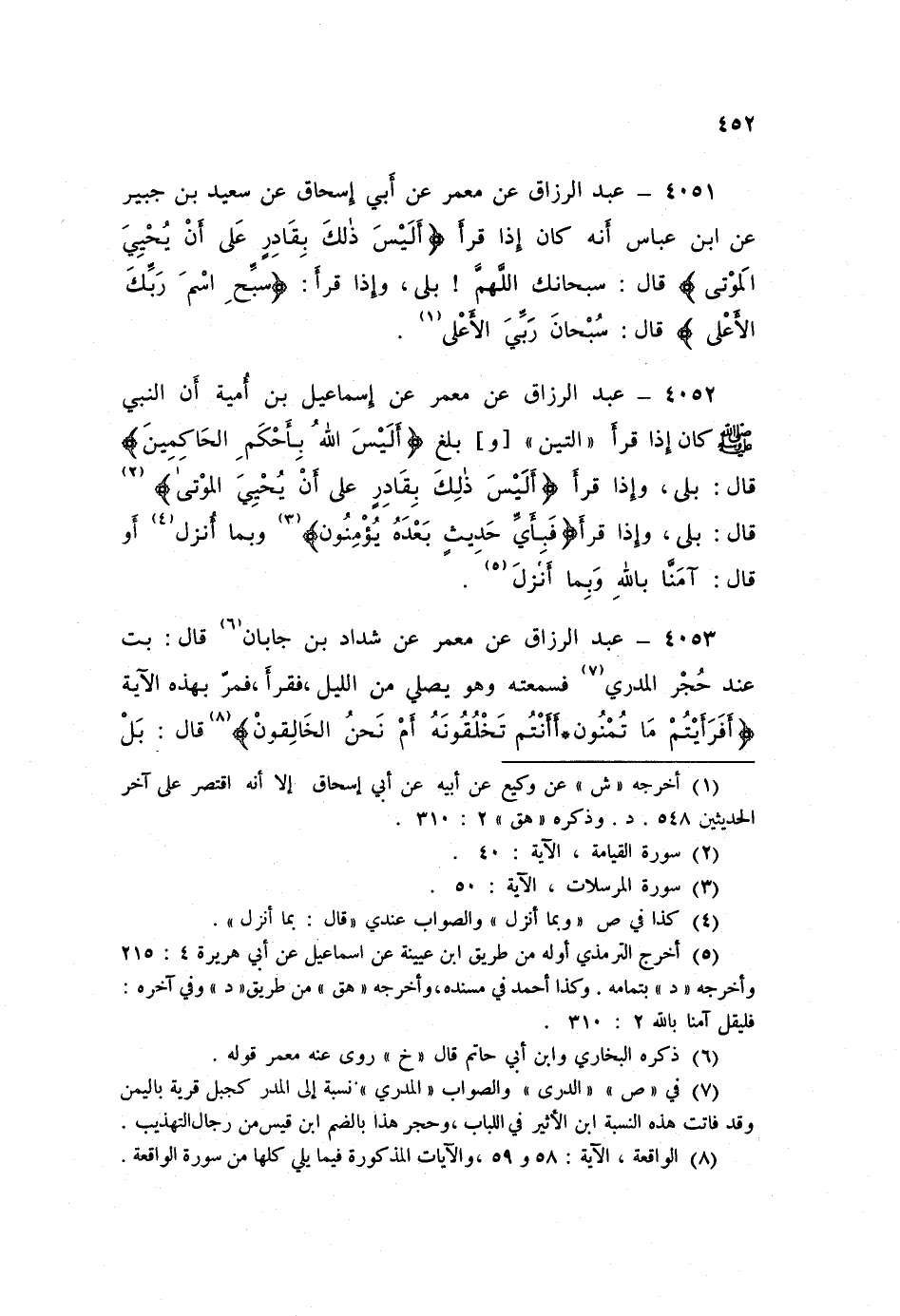 4052 - عَنْ مَعْمَرٍ، عَنْ إِسْمَاعِيلَ بْنِ أُمَيَّةَ، أَنَّ النَّبِيَّ صَلَّى اللهُ عَلَيْهِ وَسَلَّمَ كَانَ §إِذَا قَرَأَ التِّينَ، وَبَلَغَ: {أَلَيْسَ اللَّهُ بِأَحْكَمِ الْحَاكِمِينَ} [التين: 8] قَالَ: «بَلَى»، وَإِذَا قَرَأَ: {أَلَيْسَ ذَلِكَ بِقَادِرٍ عَلَى أَنْ يُحْيِيَ الْمَوْتَى} [القيامة: 40] قَالَ: «بَلَى»، وَإِذَا قَرَأَ: {فَبِأَيِّ حَدِيثٍ بَعْدَهُ يُؤْمِنُونَ} [المرسلات: 50]، وَبِمَا أُنْزِلَ أَوْ قَالَ: «آمَنَّا بِاللَّهِ وَبِمَا أَنْزَلَ»