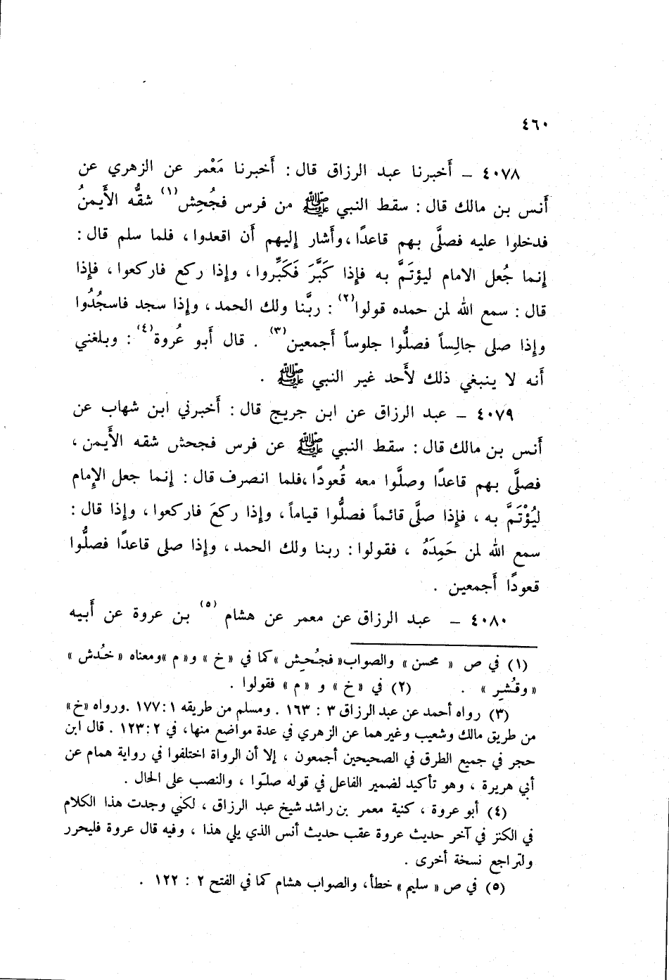 4078 - عَبْدُ الرَّزَّاقِ، أَخْبَرَنَا مَعْمَرٌ، عَنِ الزُّهْرِيِّ، عَنْ أَنَسِ بْنِ مَالِكٍ قَالَ: سَقَطَ النَّبِيُّ صَلَّى اللهُ عَلَيْهِ وَسَلَّمَ مِنْ فَرَسٍ فَجُحِشَ شِقُّهُ الْأَيْمَنُ، فَدَخَلُوا عَلَيْهِ فَصَلَّى بِهِمْ قَاعِدًا، وَأَشَارَ إِلَيْهِمْ أَنِ اقْعُدُوا، فَلَمَّا سَلَّمَ قَالَ: " إِنَّمَا §جُعِلَ الْإِمَامُ لِيُؤْتَمَّ بِهِ، فَإِذَا كَبَّرَ فَكَبِّرُوا، وَإِذَا رَكَعَ فَارْكَعُوا، فَإِذَا قَالَ: سَمِعَ اللَّهُ لِمَنْ حَمِدَهُ، قُولُوا: رَبَّنَا وَلَكَ الْحَمْدُ، وَإِذَا سَجَدَ فَاسْجُدُوا، وَإِذَا صَلَّى جَالِسًا فَصَلُّوا جُلُوسًا أَجْمَعِينَ " قَالَ أَبُو عُرْوَةَ: «وَبَلَغَنِي أَنَّهُ لَا يَنْبَغِي ذَلِكَ لِأَحَدٍ غَيْرَ النَّبِيِّ صَلَّى اللهُ عَلَيْهِ وَسَلَّمَ»