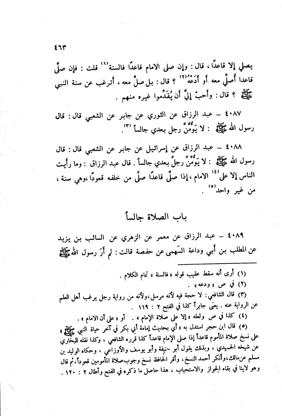 4088 - عَنْ إِسْرَائِيلَ، عَنْ جَابِرٍ، عَنِ الشَّعْبِيِّ قَالَ: قَالَ رَسُولُ اللَّهِ صَلَّى اللهُ عَلَيْهِ وَسَلَّمَ: «§لَا يُؤَمَّنَّ رَجُلٌ بَعْدِي جَالِسًا» قَالَ عَبْدُ الرَّزَّاقِ: «وَمَا رَأَيْتُ النَّاسَ إِلَّا عَلَى الْإِمَامِ، إِذَا صَلَّى قَاعِدًا صَلَّى مَنْ خَلْفَهُ قُعُودًا، وَهِيَ سُنَّةٌ مِنْ غَيْرِ وَاحِدٍ»