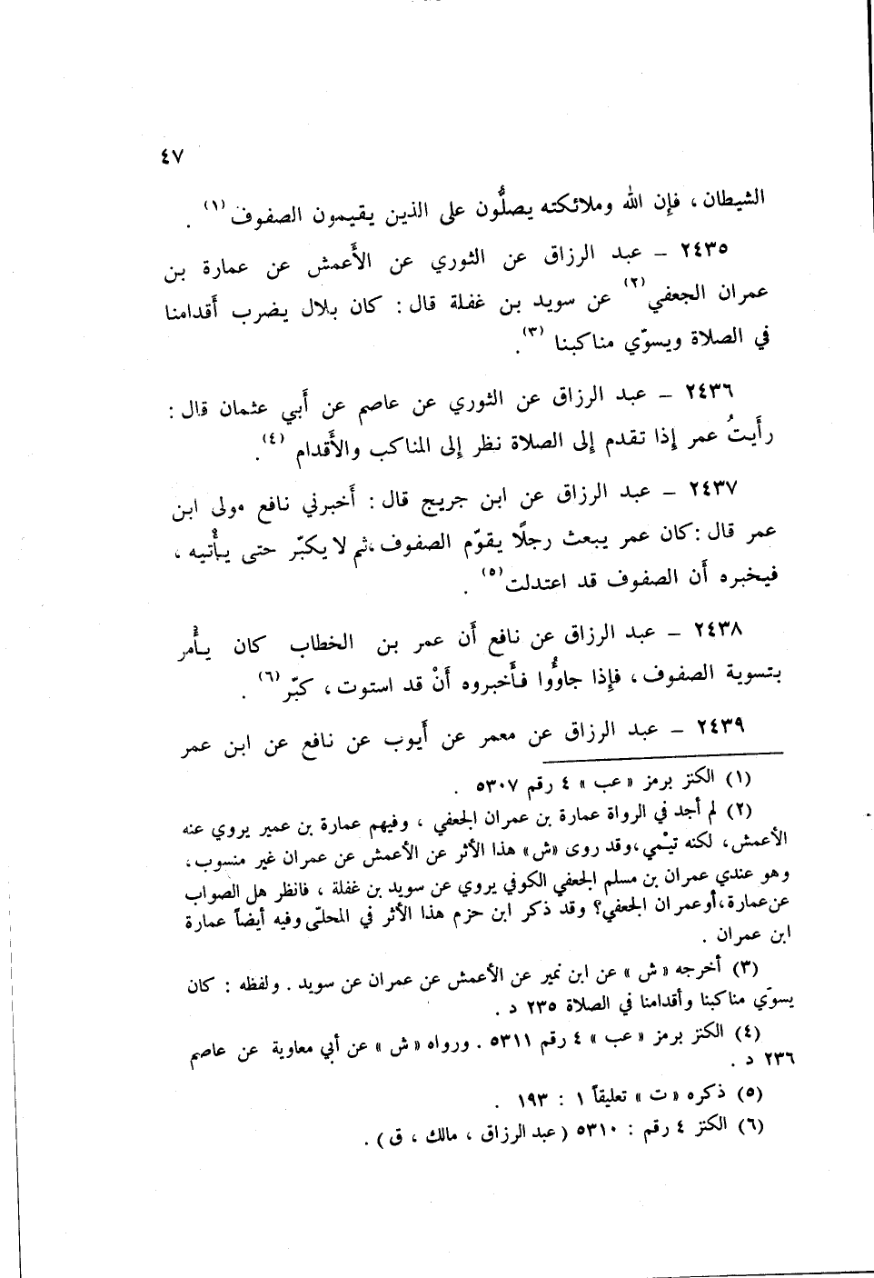 2437 - عَنِ ابْنِ جُرَيْجٍ قَالَ: أَخْبَرَنِي نَافِعٌ، مَوْلَى ابْنِ عُمَرَ قَالَ: «كَانَ عُمَرُ §يَبْعَثُ رَجُلًا يُقَوِّمُ الصُّفُوفَ، ثُمَّ لَا يُكَبِّرُ حَتَّى يَأْتِيَهُ، فِيُخْبِرَهُ أَنَّ الصُّفُوفَ قَدِ اعْتَدَلَتْ»