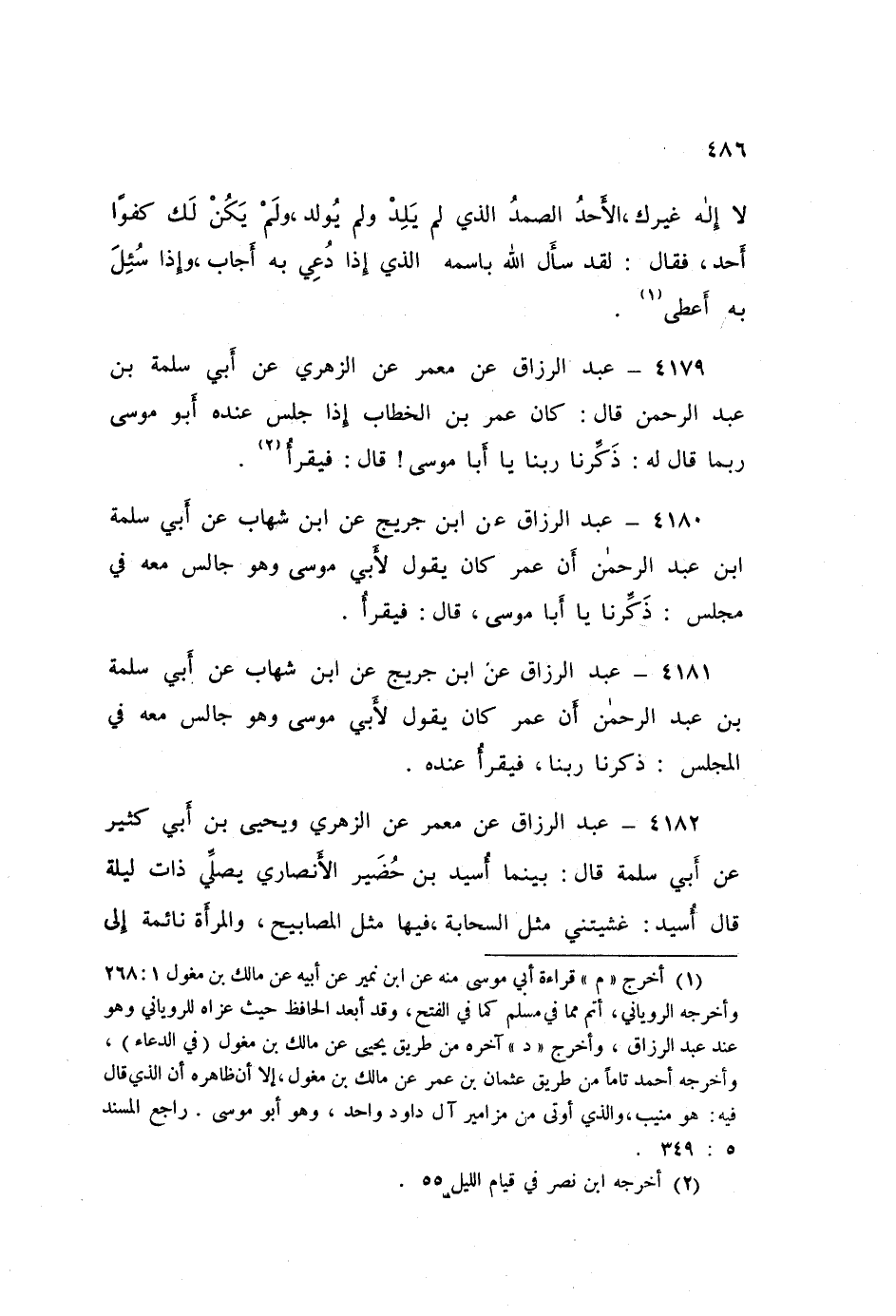 4180 - عَنِ ابْنِ جُرَيْجٍ، عَنِ ابْنِ شِهَابٍ، عَنْ أَبِي سَلَمَةَ ابْنِ عَبْدِ الرَّحْمَنِ، أَنَّ عُمَرَ، كَانَ يَقُولُ لِأَبِي مُوسَى وَهُوَ جَالِسٌ مَعَهُ فِي مَجْلِسٍ: §ذَكِّرْنَا يَا أَبَا مُوسَى قَالَ: «فَيَقْرَأُ»