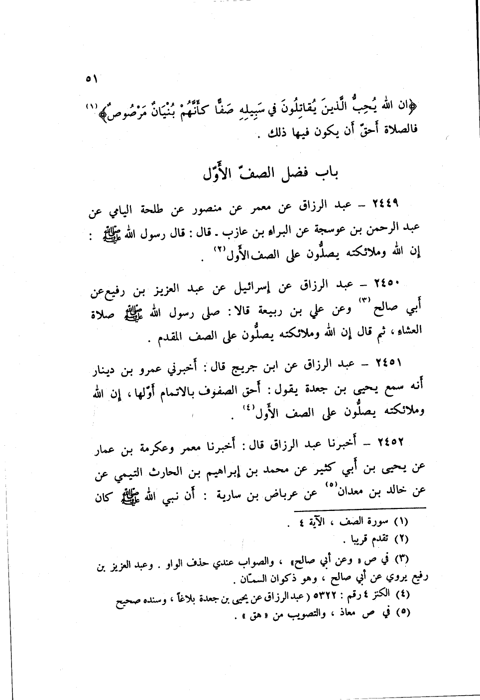 2451 - عَنِ ابْنِ جُرَيْجٍ قَالَ: أَخْبَرَنِي عَمْرُو بْنُ دِينَارٍ، أَنَّهُ سَمِعَ يَحْيَى بْنَ جَعْدَةَ يَقُولُ: «§أَحَقُّ الصُّفُوفِ بِالْإِتْمَامِ أَوَّلُهَا، إِنَّ اللَّهَ وَمَلَائِكَتَهُ يُصَلُّونَ عَلَى الصَّفِّ الْأَوَّلِ»