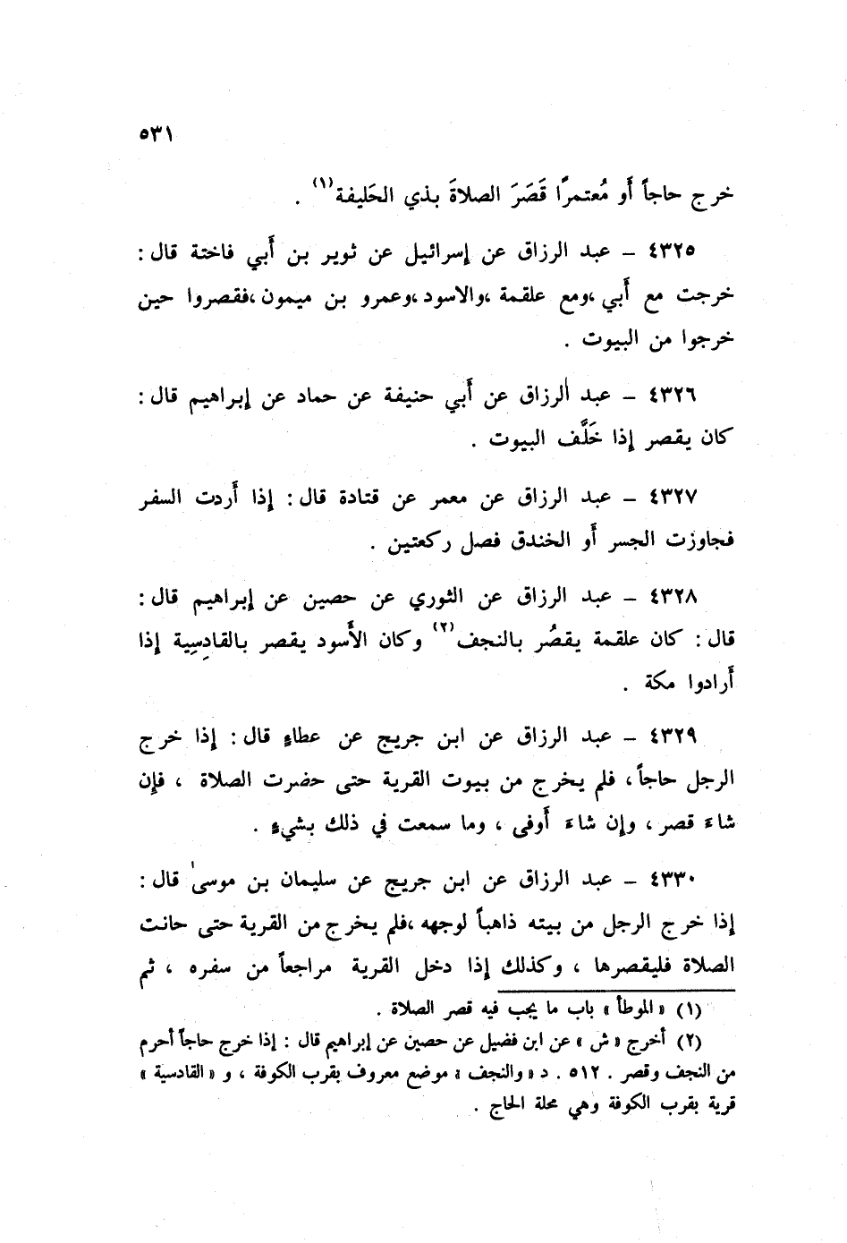 4328 - عَنِ الثَّوْرِيِّ، عَنْ حُصَيْنٍ، عَنْ إِبْرَاهِيمَ قَالَ: «كَانَ §عَلْقَمَةُ يَقْصُرُ بِالنَّجَفِ، وَكَانَ الْأَسْوَدُ يَقْصُرُ بِالْقَادِسِيَّةِ إِذَا أَرَادُوا مَكَّةَ»