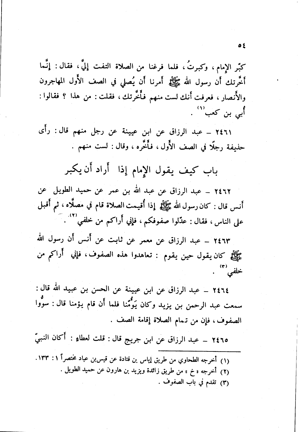 2465 - عَنِ ابْنِ جُرَيْجٍ قَالَ: قُلْتُ لِعَطَاءٍ: أَكَانَ النَّبِيُّ صَلَّى اللهُ عَلَيْهِ وَسَلَّمَ §يُسَوِّي صُفُوفَ النَّاسِ هُوَ بِنَفْسِهِ مِنْ وَرَائِهِمْ؟ قَالَ: «قَدْ سَمِعْتُهُ» قَالَ: فَحَسِبْتُ عَلَى الْأَئِمَّةِ أَنْ يَأْمُرُوا حَرَسَهُمْ بِذَلِكَ مِنْ تَسْوِيَةِ النَّاسِ؟ قَالَ: «نَعَمْ»، ثُمَّ قَالَ: «بَلْ يُؤْمَرُونَ فِيَكْفِيهِمْ إِنَّ النَّاسَ فِي ذَلِكَ الزَّمَانِ قَلِيلٌ، حَدِيثُو عَهْدٍ بِكُفْرٍ، فَكَانُوا يُعَلَّمُونَ»