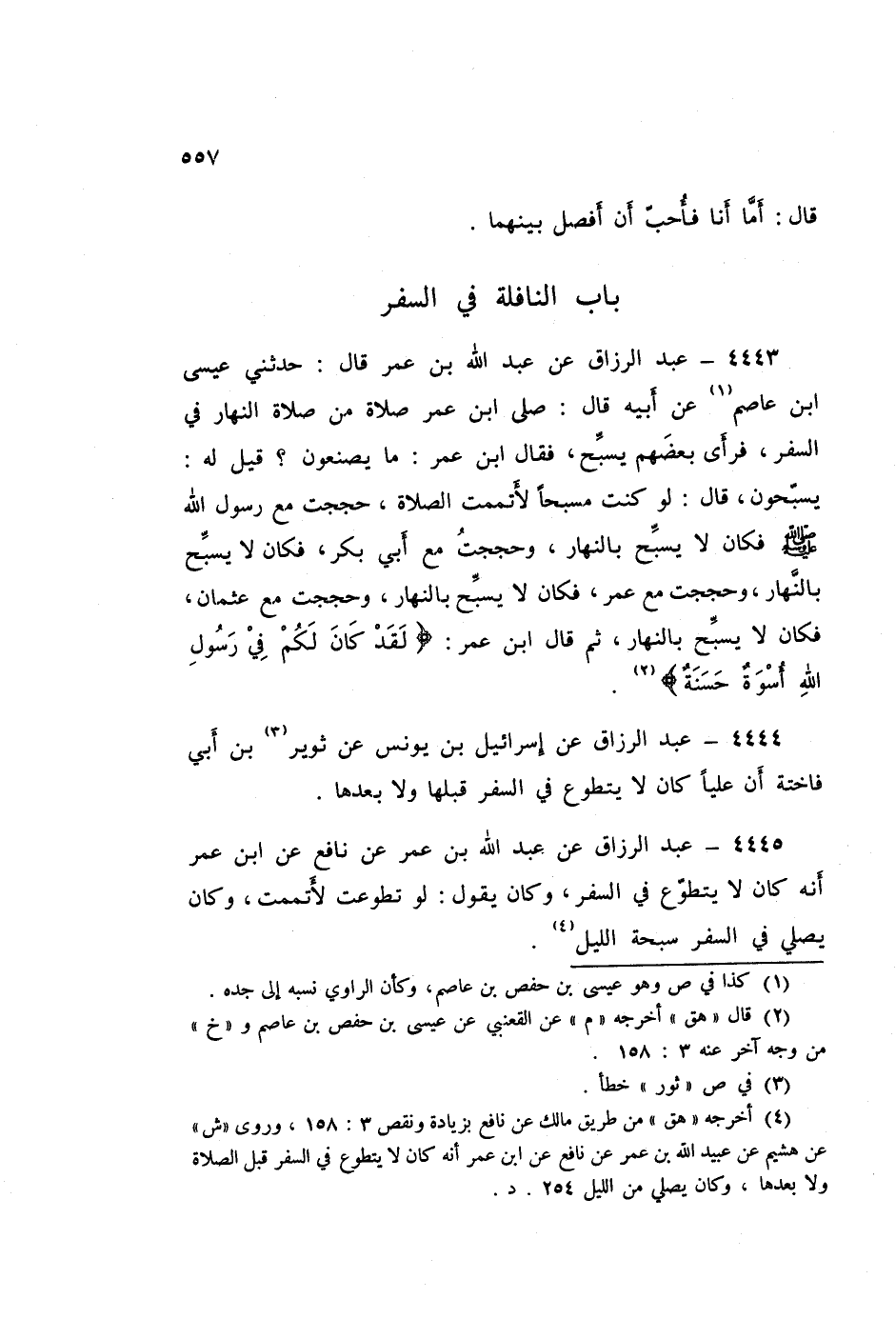 4443 - عَنْ عَبْدِ اللَّهِ بْنِ عُمَرَ قَالَ: حَدَّثَنِي عِيسَى بْنُ عَاصِمٍ، عَنْ أَبِيهِ قَالَ: صَلَّى ابْنُ عُمَرَ صَلَاةً مِنْ صَلَاةِ النَّهَارِ فِي السَّفَرِ، فَرَأَى بَعْضَهُمْ يُسَبِّحُ، فَقَالَ ابْنُ عُمَرَ: مَا يَصْنَعُونَ؟ قِيلَ لَهُ: يُسَبِّحُونَ قَالَ: «لَوْ كُنْتُ مُسَبِّحًا لَأَتْمَمْتُ الصَّلَاةَ، حَجَجْتُ مَعَ رَسُولِ اللَّهِ صَلَّى اللهُ عَلَيْهِ وَسَلَّمَ فَكَانَ §لَا يُسَبِّحُ بِالنَّهَارِ، وَحَجَجْتُ مَعَ أَبِي بَكْرٍ فَكَانَ لَا يُسَبِّحُ بِالنَّهَارِ، وَحَجَجْتُ مَعَ عُمَرَ فَكَانَ لَا يُسَبِّحُ بِالنَّهَارِ، وَحَجَجْتُ مَعَ عُثْمَانَ فَكَانَ لَا يُسَبِّحُ بِالنَّهَارِ»، ثُمَّ قَالَ ابْنُ عُمَرَ: {لَقَدْ كَانَ لَكُمْ فِي رَسُولِ اللَّهِ أُسْوَةٌ حَسَنَةٌ} [الأحزاب: 21]