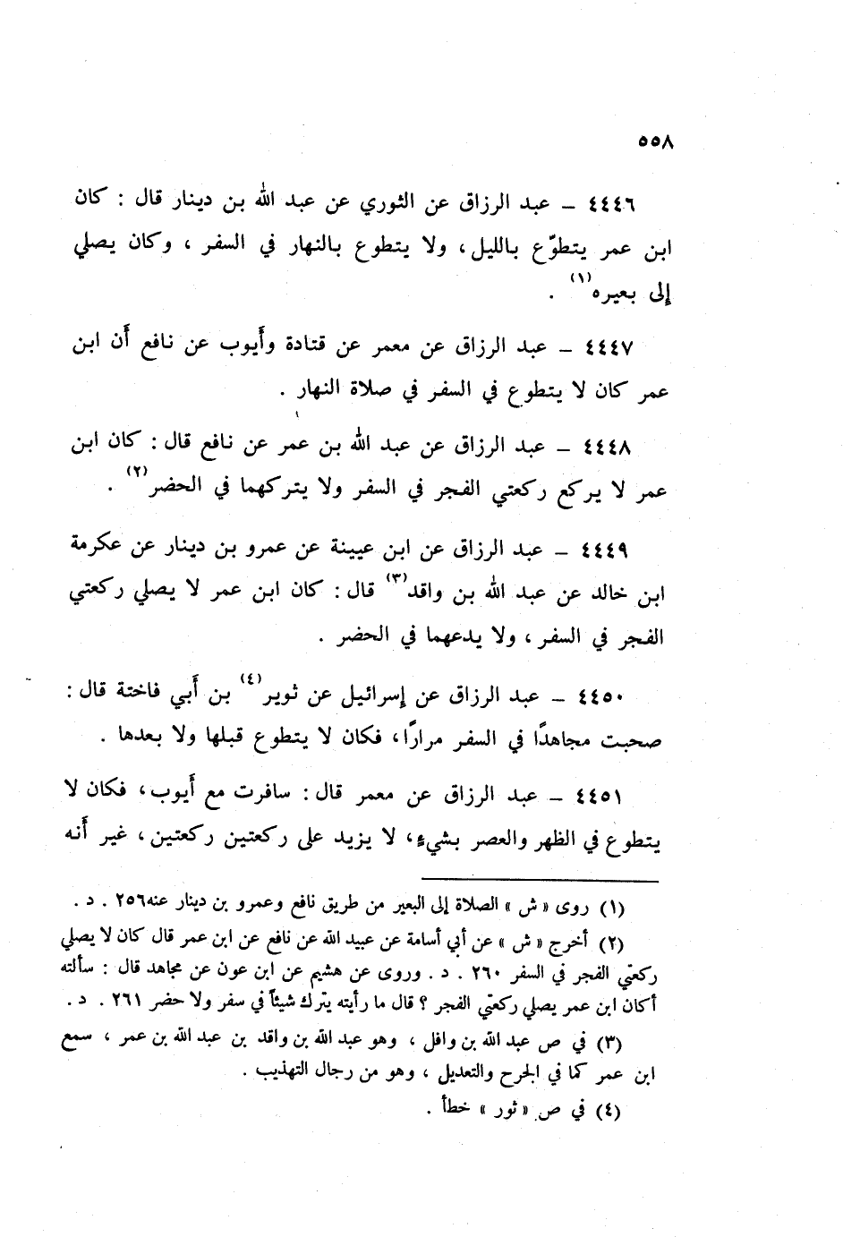 4447 - عَنْ مَعْمَرٍ، عَنْ قَتَادَةَ وَأَيُّوبَ، عَنْ نَافِعٍ، أَنَّ ابْنَ عُمَرَ كَانَ §لَا يَتَطَوَّعُ فِي السَّفَرِ فِي صَلَاةِ النَّهَارِ