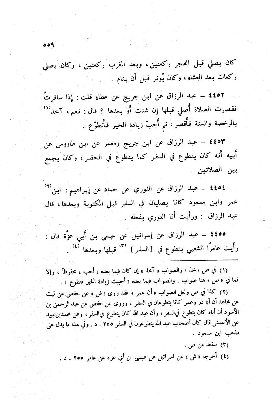 4454 - عَنِ الثَّوْرِيِّ، عَنْ حَمَّادٍ، عَنْ إِبْرَاهِيمَ، أَنَّ عُمَرَ وَابْنَ مَسْعُودٍ كَانَا §يُصَلِّيَانِ فِي السَّفَرِ قَبْلَ الْمَكْتُوبَةِ وَبَعْدَهَا. قَالَ عَبْدُ الرَّزَّاقِ: «وَرَأَيْتُ أَنَا الثَّوْرِيَّ يَفْعَلُهُ»
