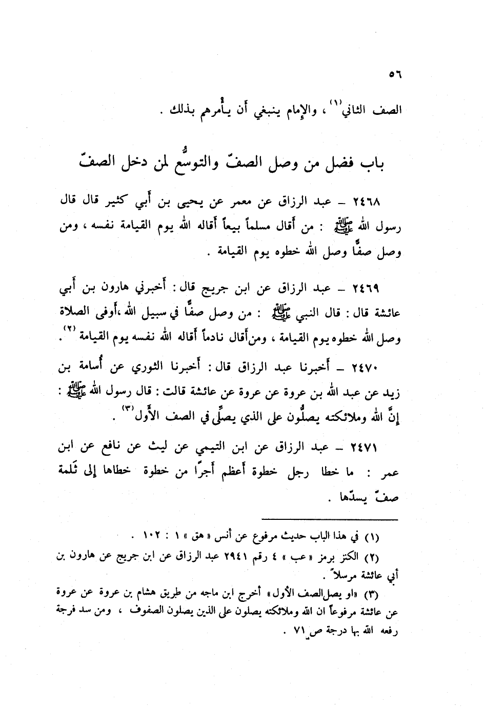 2469 - عَنِ ابْنِ جُرَيْجٍ قَالَ: أَخْبَرَنِي هَارُونُ بْنُ أَبِي عَائِشَةَ، قَالَ: قَالَ النَّبِيُّ صَلَّى اللهُ عَلَيْهِ وَسَلَّمَ: «§مَنْ وَصَلَ صَفًّا فِي سَبِيلِ اللَّهِ أَوْ فِي الصَّلَاةِ وَصَلَ اللَّهُ خَطْوَهُ يَوْمَ الْقِيَامَةِ، وَمَنْ أَقَالَ نَادِمًا أَقَالَهُ اللَّهُ نَفْسَهُ يَوْمَ الْقِيَامَةِ»