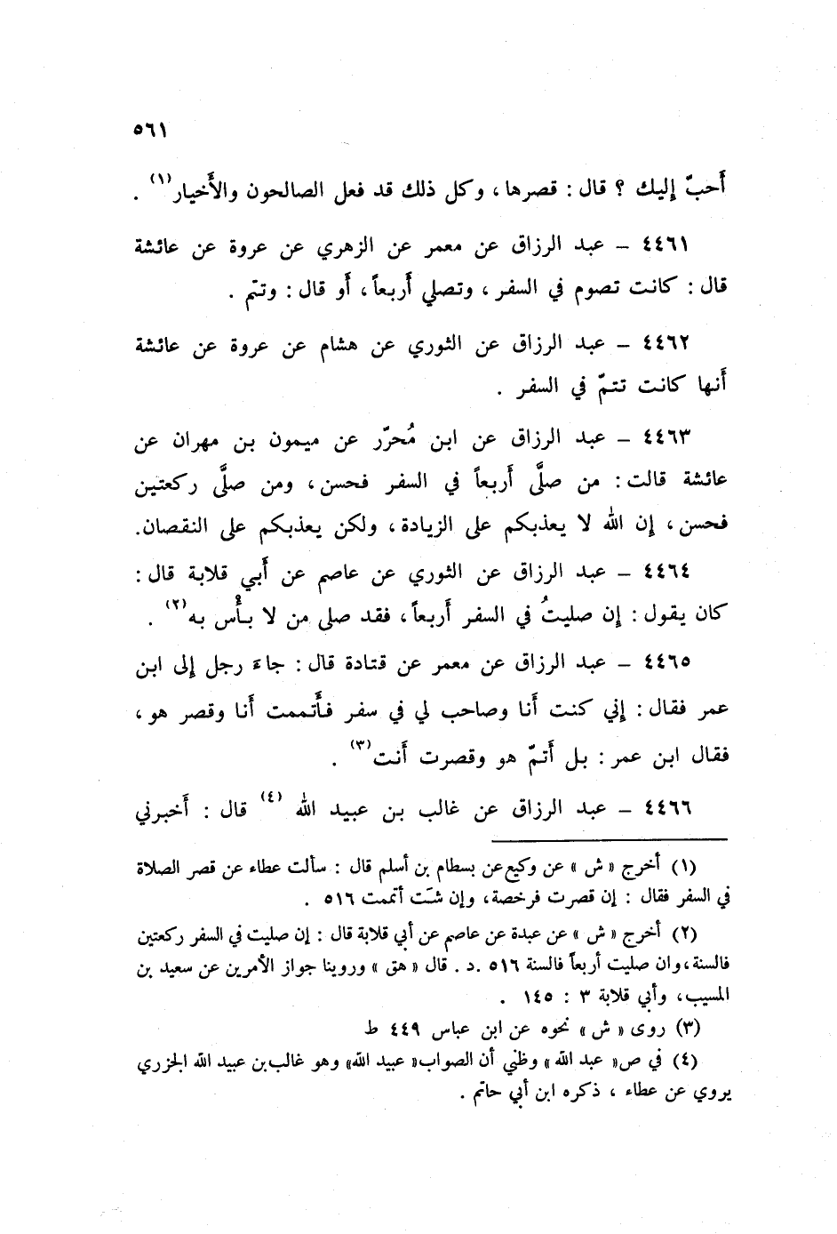 4463 - عَنِ ابْنِ مُحَرَّرٍ، عَنْ مَيْمُونِ بْنِ مِهْرَانَ، عَنْ عَائِشَةَ قَالَتْ: «§مَنْ صَلَّى أَرْبَعًا فِي السَّفَرِ فَحَسَنٌ، وَمَنْ صَلَّى رَكْعَتَيْنِ فَحَسَنٌ، إِنَّ اللَّهَ لَا يُعَذِّبُكُمْ عَلَى الزِّيَادَةِ، وَلَكِنْ يُعَذِّبُكُمْ عَلَى النُّقْصَانِ»
