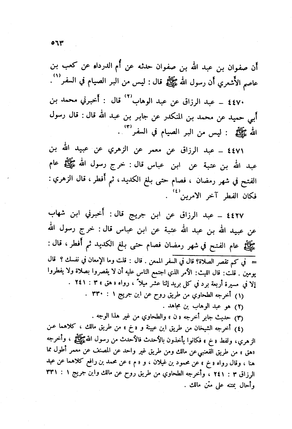 4471 - عَنْ مَعْمَرٍ، عَنِ الزُّهْرِيِّ، عَنْ عُبَيْدِ اللَّهِ بْنِ عَبْدِ اللَّهِ بْنِ عُتْبَةَ، عَنِ ابْنِ عَبَّاسٍ قَالَ: «§خَرَجَ رَسُولُ اللَّهِ صَلَّى اللهُ عَلَيْهِ وَسَلَّمَ عَامَ الْفَتْحِ فِي شَهْرِ رَمَضَانَ، فَصَامَ حَتَّى بَلَغَ الْكَدِيدَ، ثُمَّ أَفْطَرَ». قَالَ الزُّهْرِيُّ: فَكَانَ الْفِطْرُ آخِرَ الْأَمْرَيْنِ