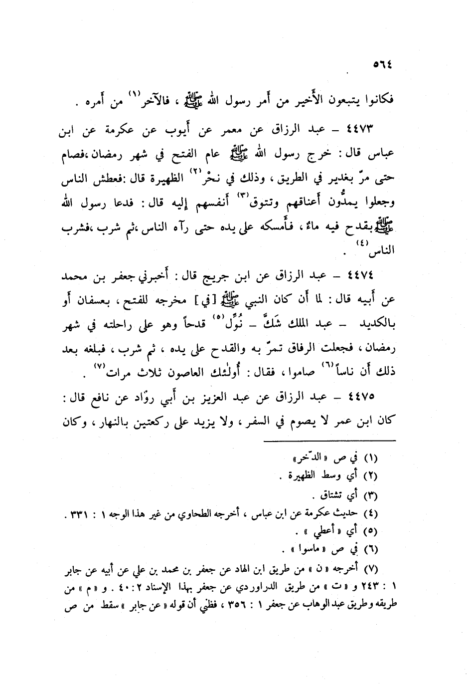 4474 - عَنِ ابْنِ جُرَيْجٍ قَالَ: أَخْبَرَنِي جَعْفَرُ بْنُ مُحَمَّدٍ، عَنْ أَبِيهِ قَالَ: لَمَّا أَنْ كَانَ النَّبِيُّ صَلَّى اللهُ عَلَيْهِ وَسَلَّمَ فِي مَخْرَجِهِ لِلْفَتْحِ بِعُسْفَانَ أَوْ بِالْكَدِيدِ - عَبْدُ الْمَلِكِ شَكَّ - نُوِّلَ قَدَحًا، وَهُوَ عَلَى رَاحِلَتِهِ فِي شَهْرِ رَمَضَانَ، فَجَعَلْتِ الرِّفَاقُ تَمُرُّ بِهِ، وَالْقَدَحُ عَلَى يَدَهِ ثُمَّ §شَرِبَ، فَبَلَغَهُ بَعْدَ ذَلِكَ أَنَّ نَاسًا صَامُوا، فَقَالَ: «أُولَئِكَ العَاصُونَ» ثَلَاثَ مَرَّاتٍ
