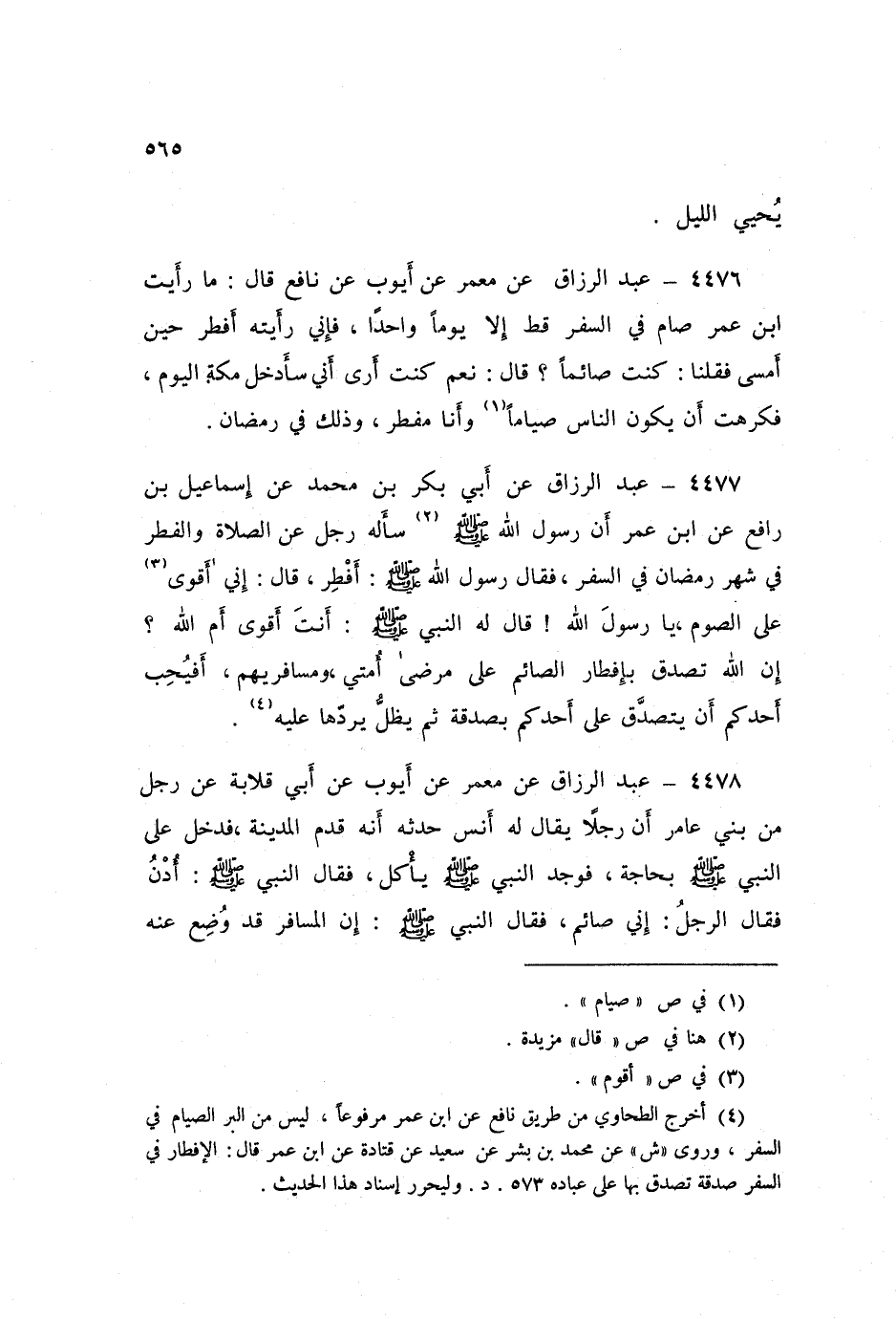 4477 - عَنْ أَبِي بَكْرِ بْنِ مُحَمَّدٍ، عَنْ إِسْمَاعِيلَ بْنِ رَافِعٍ، عَنِ ابْنِ عُمَرَ، أَنَّ رَسُولَ اللَّهِ صَلَّى اللهُ عَلَيْهِ وَسَلَّمَ سَأَلَهُ رَجُلٌ عَنِ الصَّلَاةِ وَالْفِطْرِ فِي شَهْرِ رَمَضَانَ فِي السَّفَرِ، فَقَالَ رَسُولُ اللَّهِ صَلَّى اللهُ عَلَيْهِ وَسَلَّمَ: «أَفْطِرْ» قَالَ: إِنِّي أَقْوَى عَلَى الصَّوْمِ يَا رَسُولَ اللَّهِ، قَالَ لَهُ النَّبِيُّ صَلَّى اللهُ عَلَيْهِ وَسَلَّمَ: «أَنْتَ أَقْوَى أَمِ اللَّهُ؟ إِنَّ §اللَّهَ تَصَدَّقَ بِإِفْطَارِ الصَّائِمِ عَلَى مَرْضَى أُمَّتِي وَمُسَافِرِيهِمْ، أَفَيُحِبُّ أَحَدُكُمْ أَنْ يَتَصَدَّقَ عَلَى أَحَدِكُمْ بِصَدَقَةٍ ثُمَّ يَظَلُّ يَرُدُّهَا عَلَيْهِ؟»