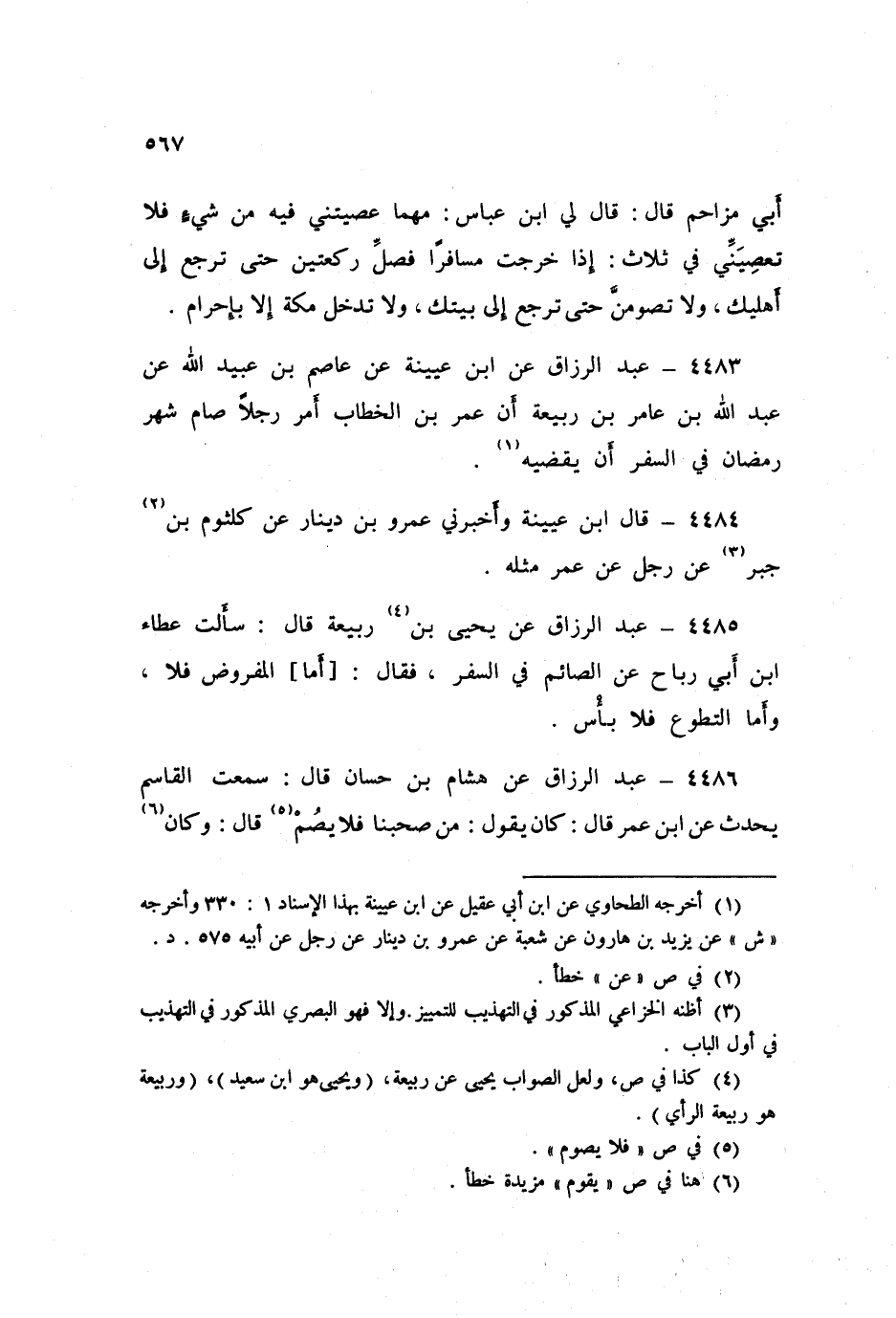 4485 - عَنْ يَحْيَى بْنِ رَبِيعَةَ قَالَ: سَأَلْتُ عَطَاءَ بْنَ أَبِي رَبَاحٍ عَنِ §الصَّائِمِ فِي السَّفَرِ، فَقَالَ: «أَمَّا الْمَفْرُوضُ فَلَا، وَأَمَّا التَّطَوُّعُ فَلَا بَأْسَ»