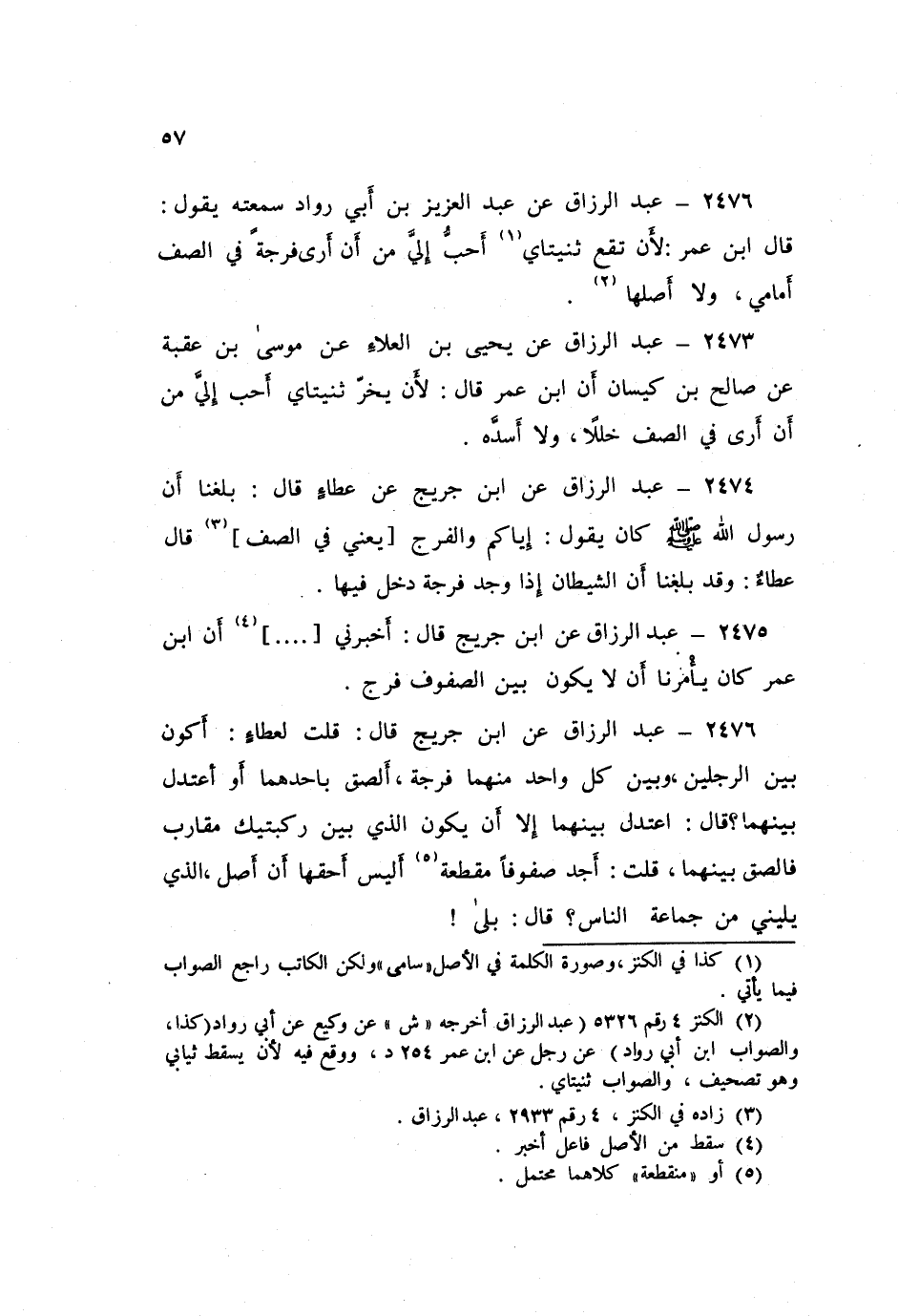 2475 - عَنِ ابْنِ جُرَيْجٍ قَالَ: أَخْبَرَنِي: «أَنَّ ابْنَ عُمَرَ كَانَ §يَأْمُرُنَا أَنْ لَا يَكُونَ بَيْنَ الصُّفُوفِ فُرَجٌ»
