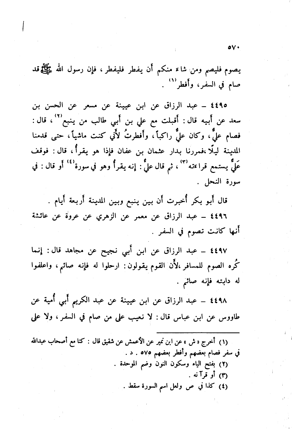 4497 - عَنِ ابْنِ أَبِي نَجِيحٍ، عَنْ مُجَاهِدٍ قَالَ: " إِنَّمَا §كُرِهَ الصَّوْمُ لِلْمُسَافِرِ لِأَنَّ الْقَوْمَ يَقُولُونَ: ارْحَلُوا لَهُ؛ فَإِنَّهُ صَائِمٌ، وَاعْلِفُوا لَهُ دَابَّتَهُ؛ فَإِنَّهُ صَائِمٌ "