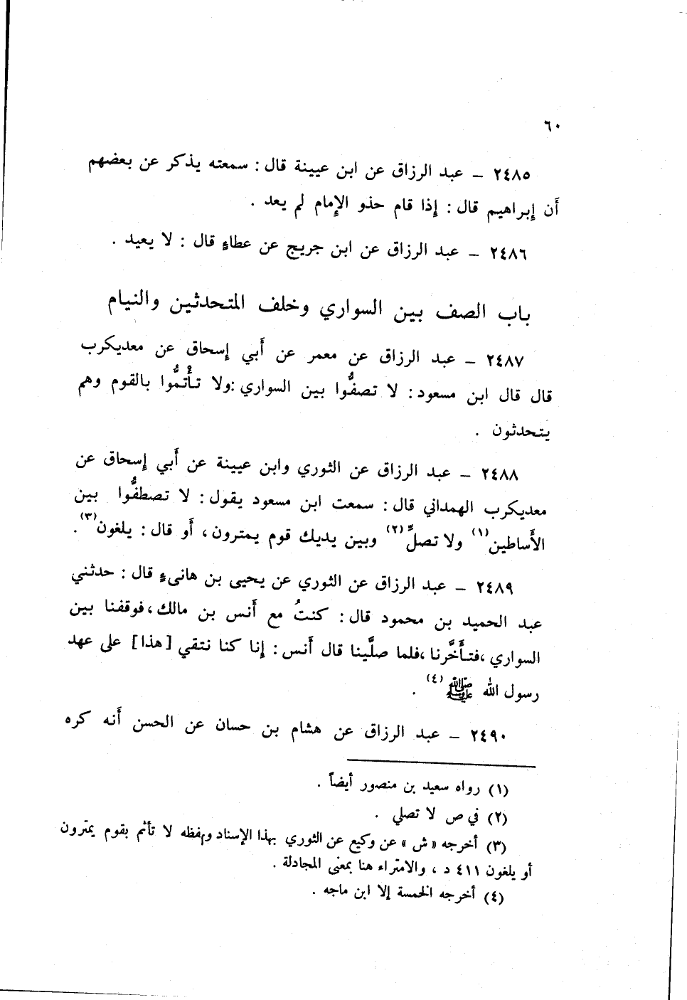 2487 - عَنْ مَعْمَرٍ، عَنْ أَبِي إِسْحَاقَ، عَنْ مَعْدِ يَكْرِبَ قَالَ: قَالَ ابْنُ مَسْعُودٍ: «§لَا تَصُفُّوا بَيْنَ السَّوَارِي، وَلَا تَأْتَمُّوا بِالْقَوْمِ وَهُمْ يَتَحَدَّثُونَ»