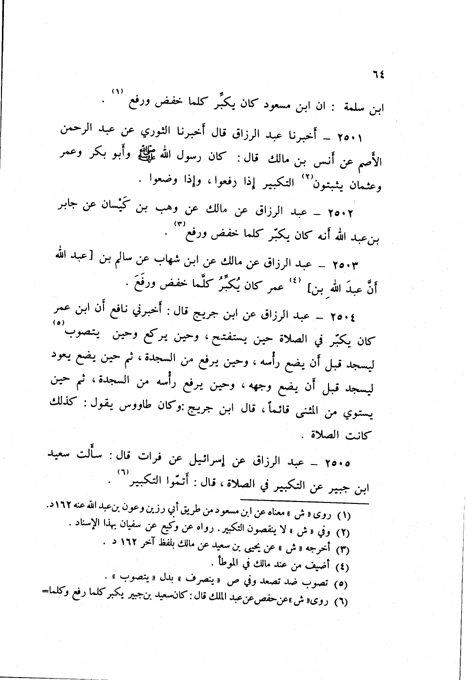 2504 - عَنِ ابْنِ جُرَيْجٍ قَالَ: أَخْبَرَنِي نَافِعٌ: «أَنَّ ابْنَ عُمَرَ كَانَ §يُكَبِّرُ فِي الصَّلَاةِ حِينَ يَسْتَفْتِحُ، وَحِينَ يَرْكَعُ، وَحِينَ يَتَصَوَّبُ لِيَسْجُدَ، قَبْلَ أَنْ يَضَعَ رَأْسَهُ، وَحِينَ يَرْفَعُ مِنَ السَّجْدَةِ، ثُمَّ حِينَ يَضَعُ يَعُودُ لِيَسْجُدَ قَبْلَ أَنْ يَضَعَ وَجْهَهُ، وَحِينَ يَرْفَعُ رَأْسَهُ مِنَ السَّجْدَةِ، ثُمَّ حِينَ يَسْتَوِي مِنَ الْمَثْنَى قَائِمًا» قَالَ ابْنُ جُرَيْجٍ: وَكَانَ طَاوُسٌ يَقُولُ: «كَذَلِكَ كَانَتِ الصَّلَاةُ»