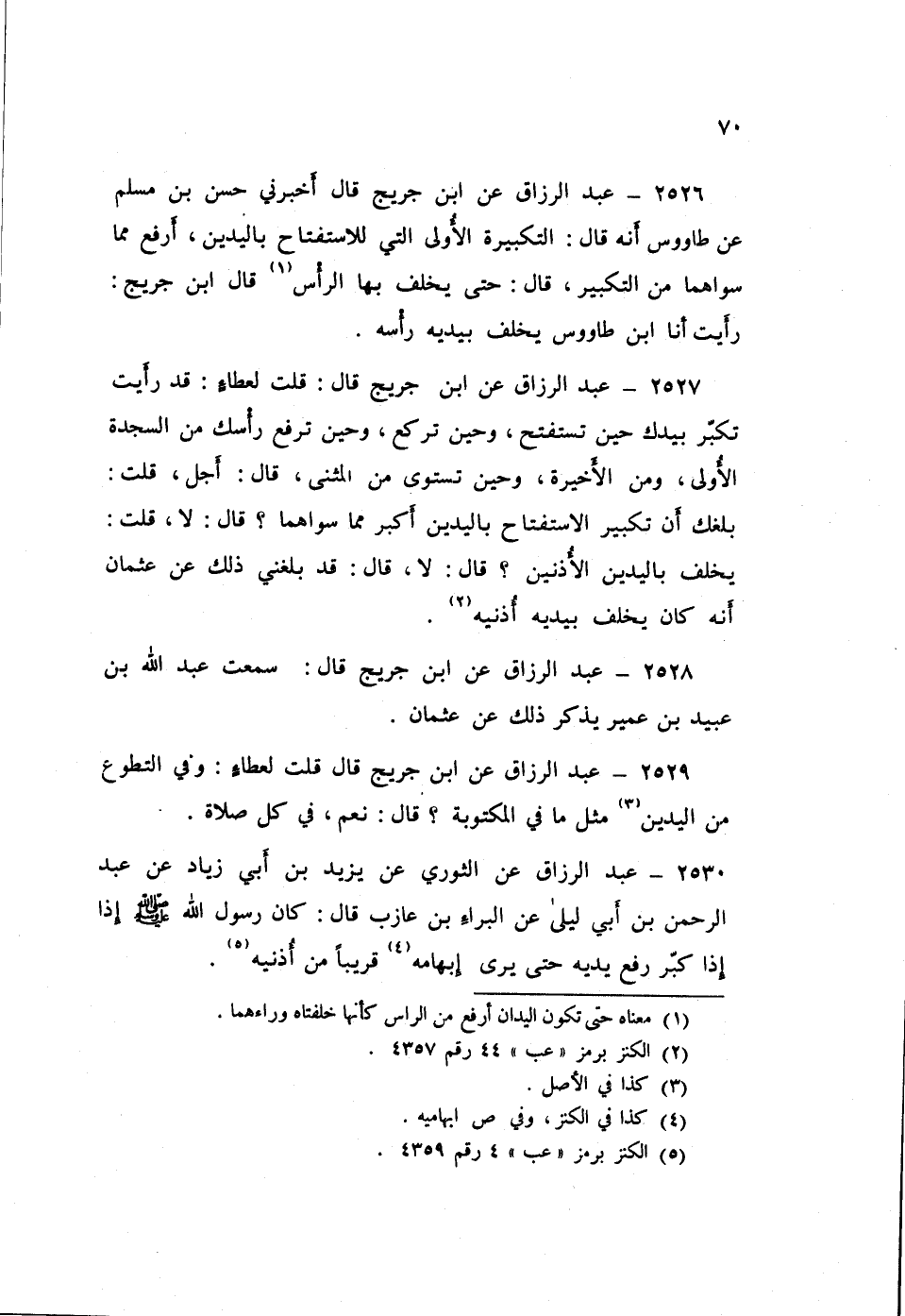 2527 - عَنِ ابْنِ جُرَيْجٍ قَالَ: قُلْتُ لِعَطَاءٍ: قَدْ رَأَيْتُ تُكَبِّرُ بِيَدِكَ حِينَ تَسْتَفْتِحُ، وَحِينَ تَرْكَعُ، وَحِينَ تَرْفَعُ رَأْسَكَ مِنَ السَّجْدَةِ الْأُولَى، وَمِنَ الْأَخِيرَةِ، وَحِينَ تَسْتَوِي مِنَ الْمَثْنَى قَالَ: «أَجَلْ»، قُلْتُ: بَلَغَكَ أَنَّ تَكْبِيرَ الِاسْتِفْتَاحِ بِالْيَدَيْنِ أَكْبَرُ مِمِّا سِوَاهُمَا؟ قَالَ: «لَا»، قُلْتُ: يَخْلِفُ بِالْيَدَيْنِ الْأُذُنَيْنِ؟ قَالَ: «لَا» قَالَ: «قَدْ بَلَغَنِي ذَلِكَ عَنْ عُثْمَانَ أَنَّهُ كَانَ §يَخْلِفُ بِيَدَيْهِ أُذُنَيْهِ» عَبْدُ الرَّزَّاقِ،