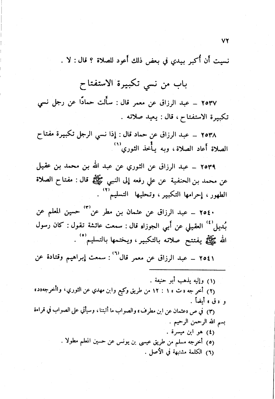 2537 - عَنْ مَعْمَرٍ قَالَ: سَأَلْتُ حَمَّادًا: عَنْ رَجُلٍ §نَسِيَ تَكْبِيرَةَ الِاسْتِفْتَاحِ قَالَ: «يُعِيدُ صَلَاتَهُ»