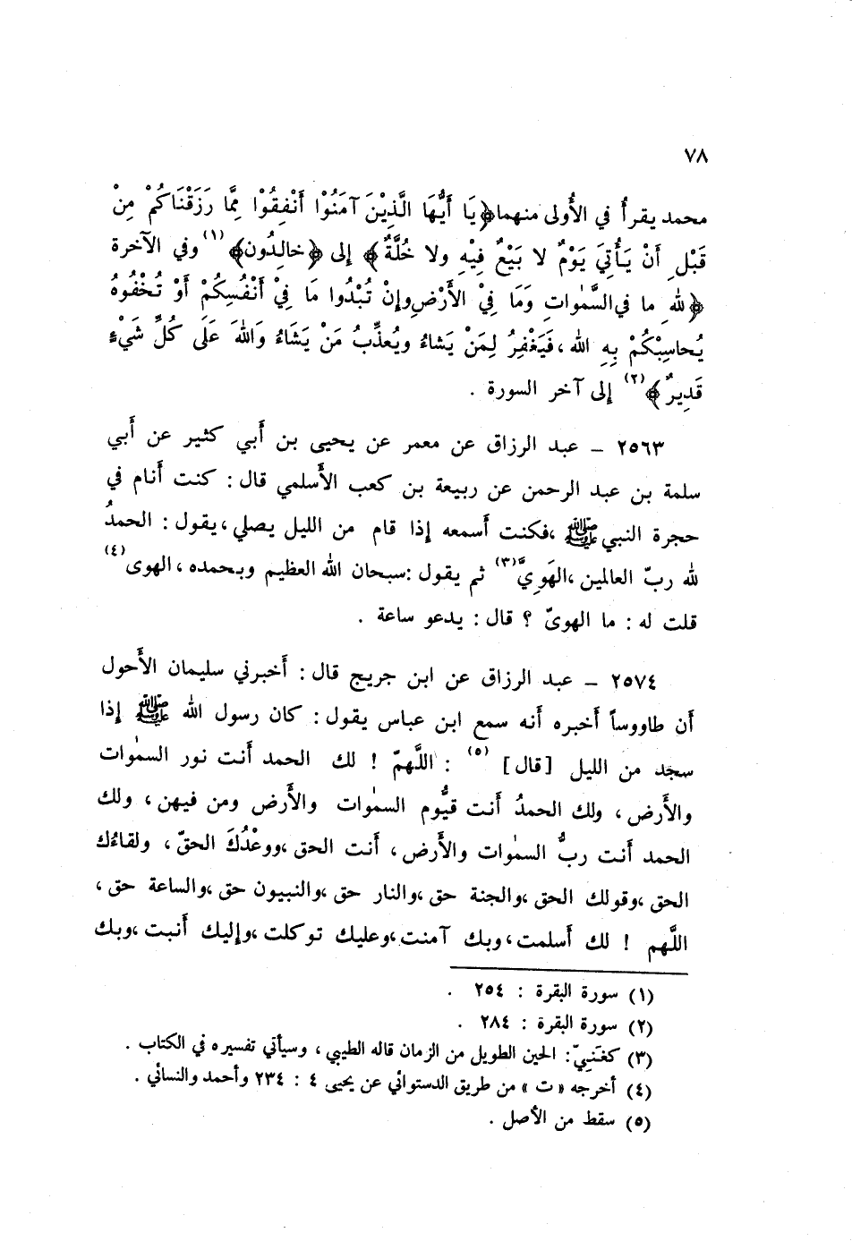 2564 - عَنِ ابْنِ جُرَيْجٍ قَالَ: أَخْبَرَنِي سُلَيْمَانُ الْأَحْوَلُ، أَنَّ طَاوُسًا أَخْبَرَهُ، أَنَّهُ سَمِعَ ابْنَ عَبَّاسٍ يَقُولُ: كَانَ رَسُولُ اللَّهِ صَلَّى اللهُ عَلَيْهِ وَسَلَّمَ §إِذَا سَجَدَ مِنَ اللَّيْلِ قَالَ: «اللَّهُمَّ لَكَ الْحَمْدُ أَنْتَ نُورُ السَّمَوَاتِ وَالْأَرْضِ، وَلَكَ الْحَمْدُ أَنْتَ قَيُّومُ السَّمَوَاتِ وَالْأَرْضِ وَمَنْ فِيهِنَّ، وَلَكَ الْحَمْدُ أَنْتَ رَبُّ السَّمَوَاتِ وَالْأَرْضِ، أَنْتَ الْحَقُّ، وَوَعْدُكَ الْحَقُّ، وَلِقَاؤُكَ الْحَقُّ، وَقَوْلُكَ الْحَقُّ، وَالْجَنَّةُ حَقٌّ، وَالنَّارُ حَقٌّ، وَالنَّبِيُّونَ حَقٌّ، وَالسَّاعَةُ حَقٌّ، اللَّهُمَّ لَكَ أَسْلَمْتُ، وَبِكَ آمَنْتُ، وَعَلَيْكَ تَوَكَّلْتُ، وَإِلَيْكَ أَنَبْتُ، وَبِكَ -[79]- خَاصَمْتُ، وَإِلَيْكَ حَاكَمْتُ، فَاغْفِرْ لِي مَا قَدَّمْتُ وَمَا أَخَّرْتُ، وَمَا أَسْرَرْتُ وَمَا أَعْلَنْتُ، أَنْتَ إِلَهِي لَا إِلَهَ إِلَّا أَنْتَ»