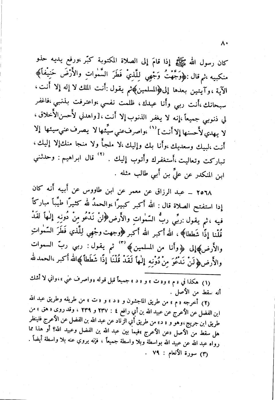 2568 - عَنْ مَعْمَرٍ، عَنِ ابْنِ طَاوُسٍ، عَنْ أَبِيهِ: أَنَّهُ كَانَ §إِذَا اسْتَفْتَحَ الصَّلَاةَ قَالَ: «اللَّهُ أَكْبَرُ كَبِيرًا، وَالْحَمْدُ للَّهِ كَثِيرًا طَيِّبًا مُبَارَكًا فِيهِ»، ثُمَّ يَقُولُ: " رَبِّي رَبُّ السَّمَوَاتِ وَالْأَرْضِ، {لَنْ نَدْعُوَ مِنْ دُونِهِ إِلَهًا لَقَدْ قُلْنَا إِذًا شَطَطًا} [الكهف: 14]، اللَّهُ أَكْبَرُ اللَّهُ أَكْبَرُ، {وَجَّهْتُ وَجْهِيَ لِلَّذِي فَطَرَ السَّمَوَاتِ وَالْأَرْضَ}، إِلَيَّ {وَأَنَا مِنَ الْمُسْلِمِينَ} [يونس: 90] "، ثُمَّ يَقُولُ: " رَبِّي رَبُّ السَّمَوَاتِ وَالْأَرْضِ {لَنْ نَدْعُوَ مِنْ دُونِهِ إِلَهًا لَقَدْ قُلْنَا إِذًا شَطَطًا} [الكهف: 14]، اللَّهُ أَكْبَرُ، الْحَمْدُ للَّهِ -[81]-، لَا إِلَهَ إِلَّا اللَّهُ، وَسُبْحَانَ اللَّهِ، وَتَبَارَكَ اللَّهُ، وَتَعَالَى اللَّهُ، مَا شَاءَ اللَّهُ، لَا حَوْلَ وَلَا قُوَّةَ إِلَّا بِاللَّهِ، أَشْهَدُ أَنَّ اللَّهَ عَلَى كُلِّ شَيْءٍ قَدِيرٌ، وَأَنَّ اللَّهَ سُبْحَانَهُ سُبْحَانَ رَبِّيَ الْأَعْلَى، سُبْحَانَ الْمَلِكِ الْقُدُّوسِ الْعَزِيزِ الْحَكِيمِ، رَبِّ اغْفِرْ لِي، رَبِّ ارْحَمْنِي، {رَبِّ أَعُوذُ بِكَ مِنْ هَمَزَاتِ الشَّيَاطِينِ وَأَعُوذُ بِكَ رَبِّ أَنْ يَحْضُرُونِ} [المؤمنون: 98]، أَعُوذُ بِاللَّهِ مِنَ الشَّيْطَانِ الرَّجِيمِ، إِنَّ اللَّهَ هُوَ السَّمِيعُ الْعَلِيمُ " قَالَ: كَانَ يَقُولُ: «هَذَا هُوَ التَّطَوُّعُ»