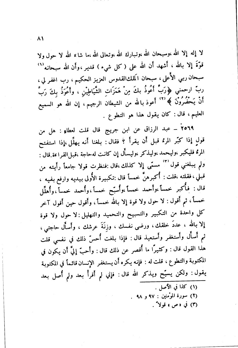 2569 - عَنِ ابْنِ جُرَيْجٍ قَالَ: قُلْتُ لِعَطَاءٍ: هَلْ مِنْ قَوْلٍ إِذَا كَبَّرَ الْمَرْءُ قَبْلَ أَنْ يَقْرَأَ؟ فَقَالَ: «بَلَغَنَا أَنَّهُ §يُهَلِّلُ، إِذَا اسْتَفْتَحَ الْمَرْءُ فَلْيُكَبِّرْ، وَلْيَحْمَدْ، وَلْيَذْكُرْ، وَلْيَسْأَلْ إِنْ كَانَتْ لَهُ حَاجَةٌ قَبْلَ الْقِرَاءَةِ» قَالَ: «وَلَمْ يَبْلُغْنِي قَوْلٌ مُسَمَّى إِلَّا كَذَلِكَ» قَالَ: «فَنَظَرْتُ قَوْلًا جَامِعًا رَأَيْتُهُ مِنْ قَبْلِي فَقُلْتُهُ»، قُلْتُ: أُكَبِّرُهُنَّ خَمْسًا قَالَ: تَكْبِيرَةُ الْأُولَى بِيَدَيْهِ وَارْفَعْ بِفِيهِ قَالَ: «فَأُكَبِّرُ خَمْسًا، وَأَحْمَدُ خَمْسًا، وَأُسَبِّحُ خَمْسًا، وَأَحْمَدُ خَمْسًا، وَأُهَلِّلُ خَمْسًا»، ثُمَّ أَقُولُ: " لَا حَوْلَ وَلَا قُوَّةَ إِلَّا بِاللَّهِ خَمْسًا، وَأَقُولُ حِينَ أَقُولُ آخِرَ كُلِّ وَاحِدَةٍ مِنَ التَّكْبِيرِ، وَالتَّسْبِيحِ، وَالتَّحْمِيدِ، وَالتَّهْلِيلِ: لَا حَوْلَ وَلَا قُوَّةَ إِلَّا بِاللَّهِ، عَدَدَ خَلْقِكَ، وَرِضَى نَفْسِكَ، وَزِنَةَ عَرْشِكَ، وَأَسْأَلُ حَاجَتِي، ثُمَّ أَسْأَلُ وَأَسْتَغْفِرُ وَأَسْتَعِيذُ " قَالَ: «فَإِذَا بَلَغْتُ أُحِسُّ ذَلِكَ فِي نَفْسِي، قُلْتُ هَذَا الْقَوْلَ» قَالَ: «وَكَثِيرًا مَا أُقَصِّرُ عَنْ ذَلِكَ» قَالَ: «وَأَحَبُّ إِلَيَّ أَنْ يَكُونَ فِي الْمَكْتُوبَةِ وَالتَّطَوُّعِ»، قُلْتُ لَهُ: فَإِنَّهُ يُكْرَهُ أَنْ يَسْتَغْفِرَ الْإِنْسَانُ قَائِمًا فِي الْمَكْتُوبَةِ يَقُولُ: «وَلَكِنْ يُسَبِّحُ وَيَذْكُرُ اللَّهَ» قَالَ: «فَإِنِّي لَمْ أَقْرَأْ بَعْدُ وَلَمْ أُصَلِّ بَعْدُ -[82]- إِنَّمَا هَذَا قَبْلَ الْقِرَاءَةِ»، قُلْتُ: فَكُنْتُ دَاعِيًا عَلَى إِنْسَانٍ حِينَئِذٍ تُسَمِّيهِ؟ قَالَ: «لَا، إِنَّمَا قُمْتُ فِي حَاجَتِي، فَأَمَّا فِي غَيْرِ ذَلِكَ فَلَا»، فَقَالَ لَهُ إِنْسَانٌ: أَتُبَالِي لَوْ تَكَلَّمْتُ حِينَئِذٍ بَعْدَ التَّكْبِيرَةِ وَقَبْلَ الْقِرَاءَةِ؟ قَالَ: «أَيْ لَعَمْرِي أَبَعْدَ مَا أُكَبِّرُ؟ لَا كَلَامَ حِينَئِذٍ بَعْدَ التَّكْبِيرَةِ وَقَبْلَ الْقِرَاءَةِ»
