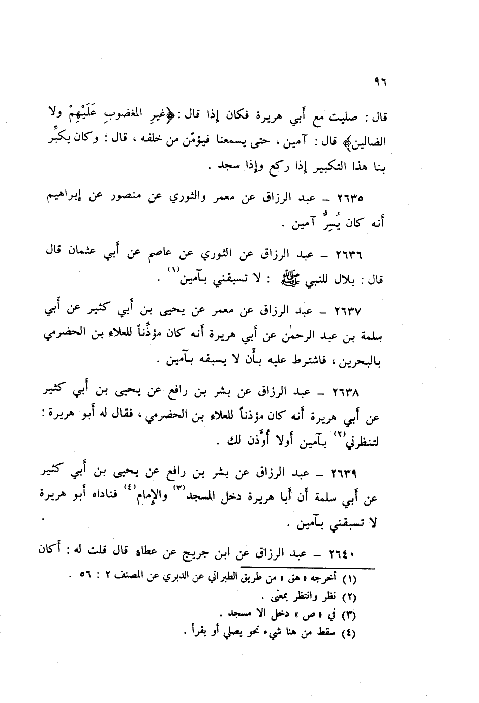 2640 - عَنِ ابْنِ جُرَيْجٍ، عَنْ عَطَاءٍ قَالَ: قُلْتُ لَهُ: أَكَانَ ابْنُ الزُّبَيْرِ §يُؤَمِّنُ عَلَى إِثْرِ أُمِّ الْقُرْآنِ؟ قَالَ: «نَعَمْ، وَيُؤَمِّنُ مَنْ وَرَاءَهُ حَتَّى أَنَّ لِلْمَسْجِدِ لَلَجَّةً»، ثُمَّ قَالَ: «إِنَّمَا آمِينَ دُعَاءٌ» وَكَانَ أَبُو هُرَيْرَةَ يَدْخُلُ الْمَسْجِدَ وَقَدْ قَامَ الْإِمَامُ قَبْلَهُ، فِيَقُولُ: «لَا تَسْبِقْنِي بِآمِينَ»