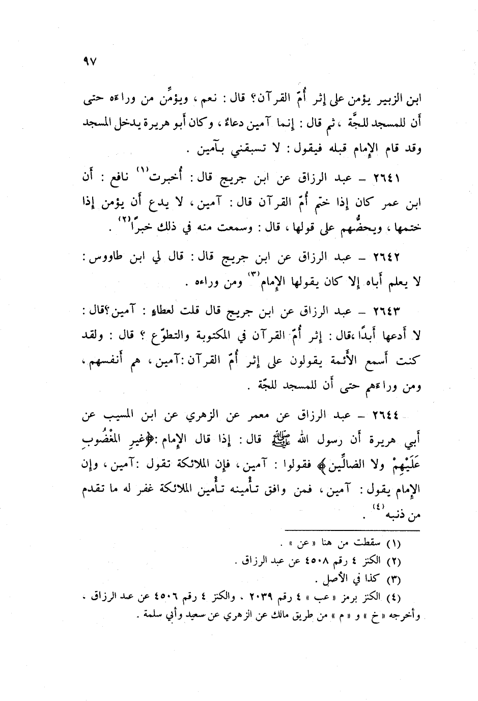 2644 - عَنْ مَعْمَرٍ، عَنِ الزُّهْرِيِّ، عَنِ ابْنِ الْمُسَيِّبِ، عَنْ أَبِي هُرَيْرَةَ، أَنَّ رَسُولَ اللَّهِ صَلَّى اللهُ عَلَيْهِ وَسَلَّمَ قَالَ: " §إِذَا قَالَ الْإِمَامُ: {غَيْرِ الْمَغْضُوبِ عَلَيْهِمْ وَلَا الضَّالِّينَ} [الفاتحة: 7]، فَقُولُوا: آمِينَ، فَإِنَّ الْمَلَائِكَةَ تَقُولُ: آمِينَ، وَإِنَّ الْإِمَامَ يَقُولُ: آمِينَ، فَمَنْ وَافَقَ تَأْمِينُهُ تَأْمِينَ الْمَلَائِكَةِ غُفِرَ لَهُ مَا تَقَدَّمَ مِنْ ذَنْبِهِ " عَبْدُ الرَّزَّاقِ،
