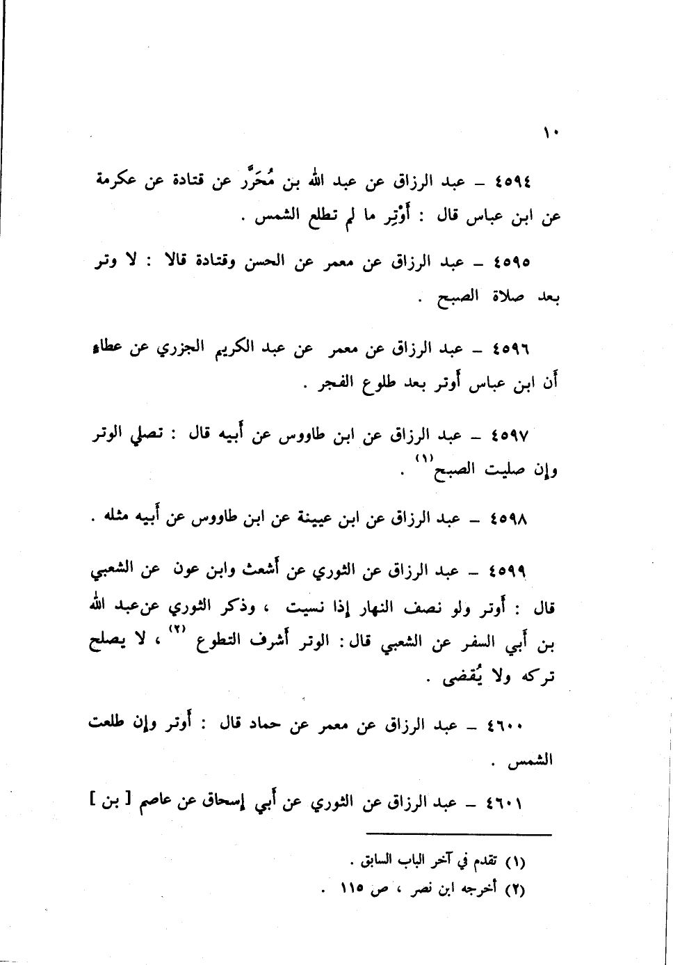 4596 - عَنْ مَعْمَرٍ، عَنْ عَبْدِ الْكَرِيمِ الْجَزَرِيِّ، عَنْ عَطَاءٍ، أَنَّ ابْنَ عَبَّاسٍ «§أَوْتَرَ بَعْدَ طُلُوعِ الْفَجْرِ»