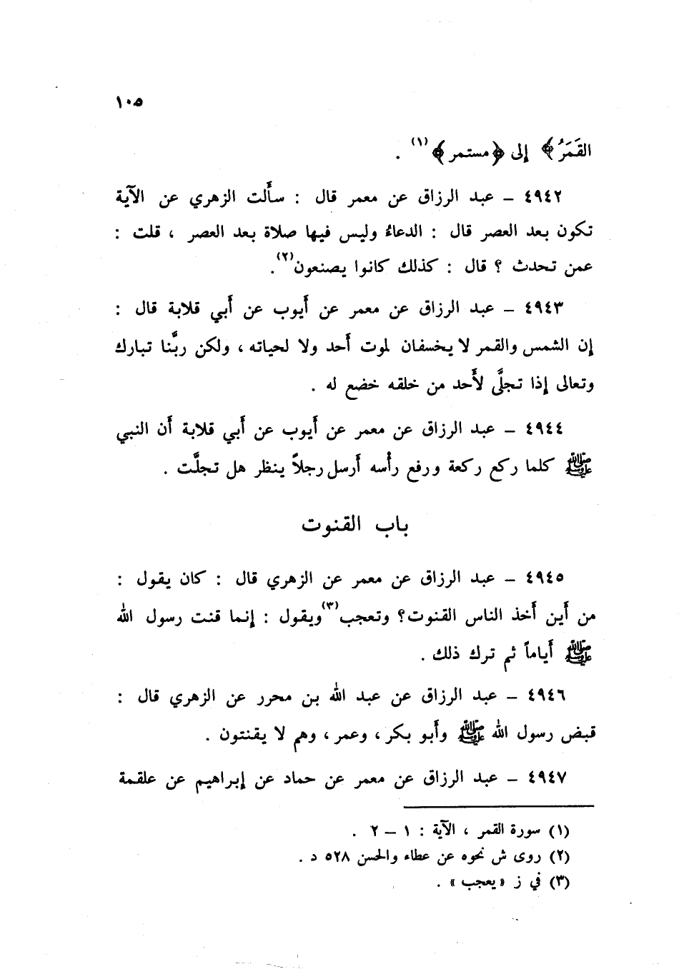 4945 - عَنْ مَعْمَرٍ، عَنِ الزُّهْرِيِّ قَالَ: كَانَ يَقُولُ: مِنْ أَيْنَ أَخَذَ النَّاسُ الْقُنُوتَ؟ وَتَعَجَّبَ، وَيَقُولُ: «إِنَّمَا §قَنَتَ رَسُولُ اللَّهِ صَلَّى اللهُ عَلَيْهِ وَسَلَّمَ أَيَّامًا ثُمَّ تَرَكَ ذَلِكَ»
