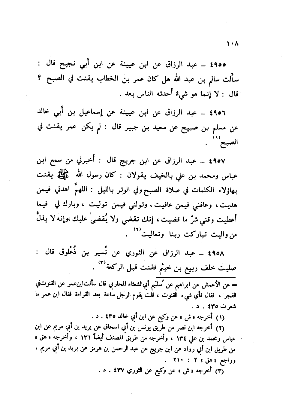 4956 - عَنِ ابْنِ عُيَيْنَةَ، عَنْ إِسْمَاعِيلَ بْنِ أَبِي خَالِدٍ، عَنْ مُسْلِمِ بْنِ صُبَيْحٍ، عَنْ سَعِيدِ بْنِ جُبَيْرٍ قَالَ: «§لَمْ يَكُنْ عُمَرُ يَقْنُتُ فِي الصُّبْحِ»