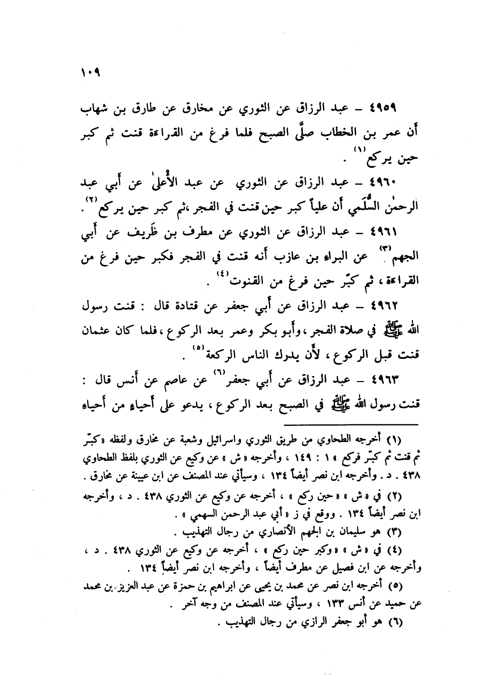 4960 - عَنِ الثَّوْرِيِّ، عَنْ عَبْدِ الْأَعْلَى، عَنْ أَبِي عَبْدِ الرَّحْمَنِ السُّلَمِيِّ، أَنَّ عَلِيًّا، «§كَبَّرَ حِينَ قَنَتَ فِي الْفَجْرِ ثُمَّ كَبَّرَ حِينَ يَرْكَعُ»