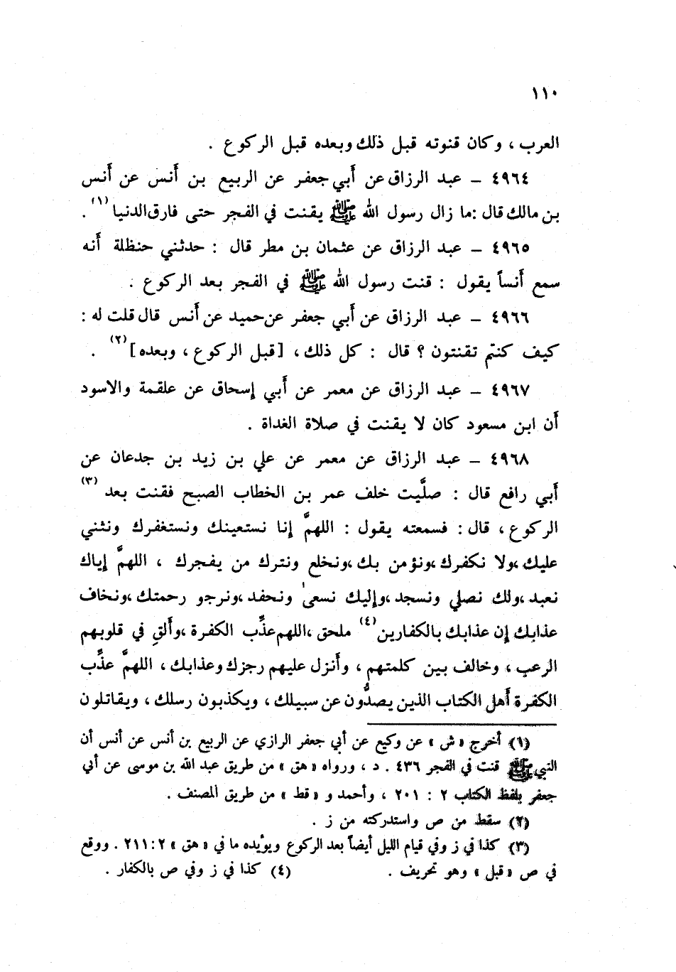 4968 - عَنْ مَعْمَرٍ، عَنْ عَلِيِّ بْنِ زَيْدِ بْنِ جُدْعَانَ، عَنْ أَبِي رَافِعٍ قَالَ: صَلَّيْتُ خَلْفَ عُمَرَ بْنِ الْخَطَّابِ الصُّبْحَ فَقَنَتَ بَعْدَ الرُّكُوعِ قَالَ: فَسَمِعْتُهُ يَقُولُ: «§اللَّهُمَّ إِنَّا نَسْتَعِينُكَ، وَنَسْتَغْفِرُكَ، وَنُثْنِي عَلَيْكَ وَلَا نَكْفُرُكَ، وَنُؤْمِنُ بِكَ وَنَخْلَعُ وَنَتْرُكُ مَنْ يَفْجُرُكَ، اللَّهُمَّ إِيَّاكَ نَعْبُدُ، وَلَكَ نُصَلِّي وَنَسْجُدُ، وَإِلَيْكَ نَسْعَى وَنَحْفِدُ، وَنَرْجُو رَحْمَتَكَ وَنَخَافُ عَذَابَكَ إِنَّ عَذَابَكَ بِالْكَفَّارِينَ مُلْحَقٌ، اللَّهُمَّ عَذِّبِ الْكَفَرَةَ، وَأَلْقِ فِي قُلُوبِهِمُ الرُّعْبَ، وَخَالِفْ بَيْنِ كَلِمَتِهِمْ، وَأَنْزِلْ عَلَيْهِمْ رِجْزَكَ وَعَذَابَكَ، اللَّهُمَّ عَذِّبِ الْكَفَرَةَ أَهْلَ الْكِتَابِ الَّذِينَ يَصُدُّونَ عَنْ سَبِيلِكَ، وَيُكَذِّبُونَ رُسُلَكَ وَيُقَاتِلُونَ -[111]- أَوْلِيَاءَكَ، اللَّهُمَّ اغْفِرْ لِلْمُؤْمِنِينَ وَالْمُؤْمِنَاتِ وَالْمُسْلِمِينَ وَالْمُسْلِمَاتِ وَأَصْلِحْ ذَاتَ بَيْنِهِمْ، وَأَلِّفْ بَيْنَ قُلُوبِهِمْ، وَاجْعَلْ فِي قُلُوبِهِمُ الْإِيمَانَ وَالْحِكْمَةَ، وَثَبِّتْهُمْ عَلَى مِلَّةِ نَبِيِّكَ، وَأَوْزِعْهُمْ أَنْ يُوَفُّوا بِالْعَهْدِ الَّذِي عَاهَدْتَهُمْ عَلَيْهِ، وَانْصُرْهُمْ عَلَى عَدُوِّكَ وَعَدُوِّهِمْ، إِلَهَ الْحَقِّ، وَاجْعَلْنَا مِنْهُمْ» قَالَ عَبْدُ الرَّزَّاقِ: وَلَوْ كُنْتُ إِمَامًا قُلْتُ هَذَا الْقَوْلَ، ثُمَّ قُلْتُ: اللَّهُمَّ اهْدِنَا فِيمَنْ هَدَيْتَ