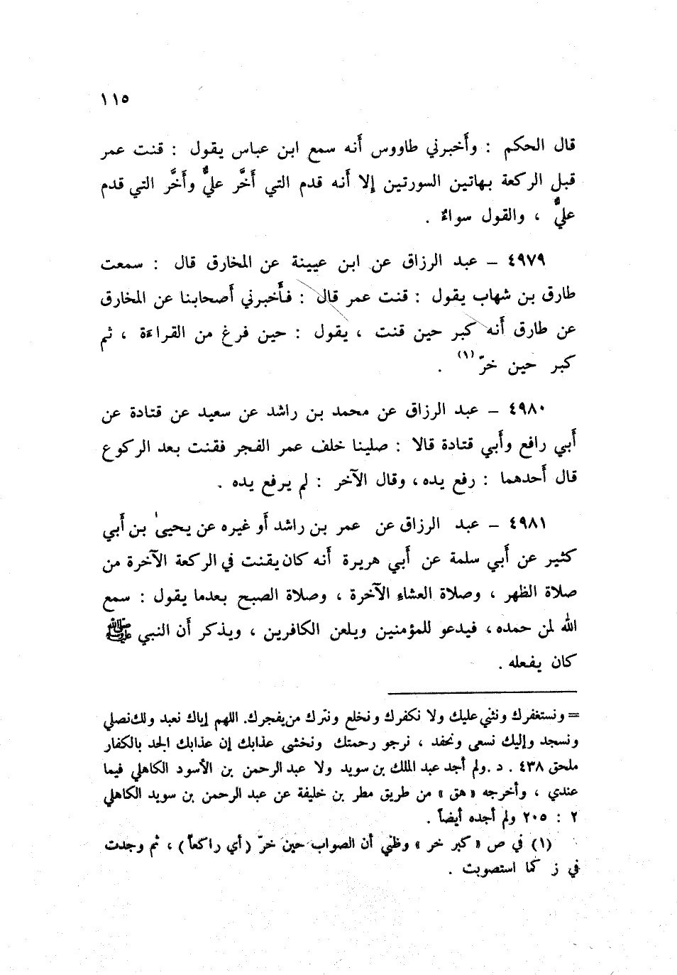 4979 - عَنِ ابْنِ عُيَيْنَةَ، عَنِ الْمُخَارِقِ قَالَ: سَمِعْتُ طَارِقَ بْنَ شِهَابٍ يَقُولُ: قَنَتَ عُمَرُ قَالَ: فَأَخْبَرَنِي أَصْحَابُنَا عَنِ الْمُخَارِقِ، عَنْ طَارِقِ «أَنَّهُ §كَبَّرَ حِينَ قَنَتَ، يَقُولُ حِينَ فَرَغَ مِنَ الْقِرَاءَةِ ثُمَّ كَبَّرَ حِينَ خَرَّ»